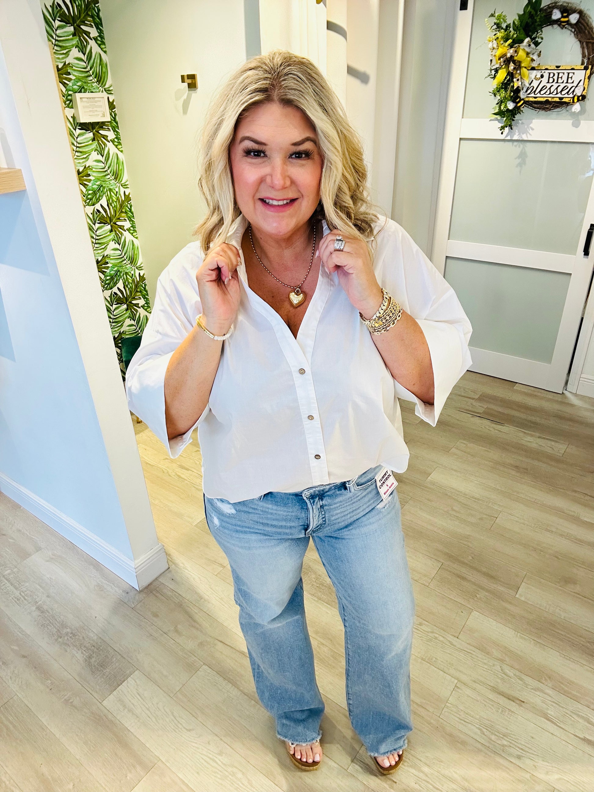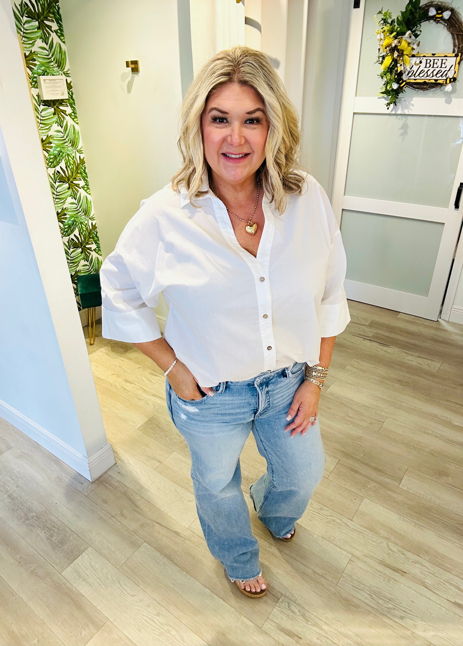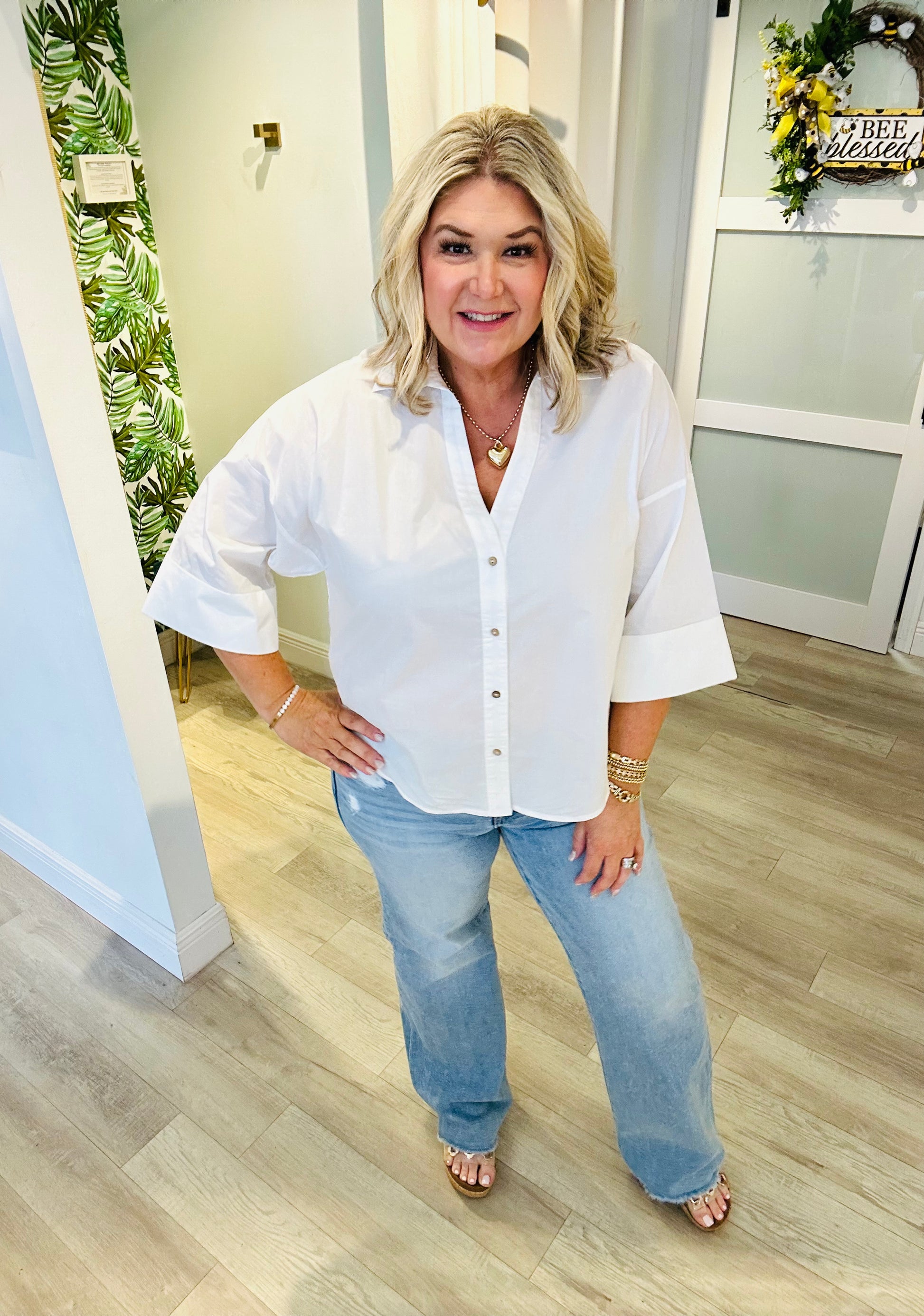 Effortlessly polished and perfectly breathable, the Back to Business Top is your new go-to for looking put-together without even trying. Crafted from 100% crisp cotton, this collared blouse features a classic button-down front, a chic button-back plate detail, and modern 3/4 sleeves for an elevated, everyday silhouette.