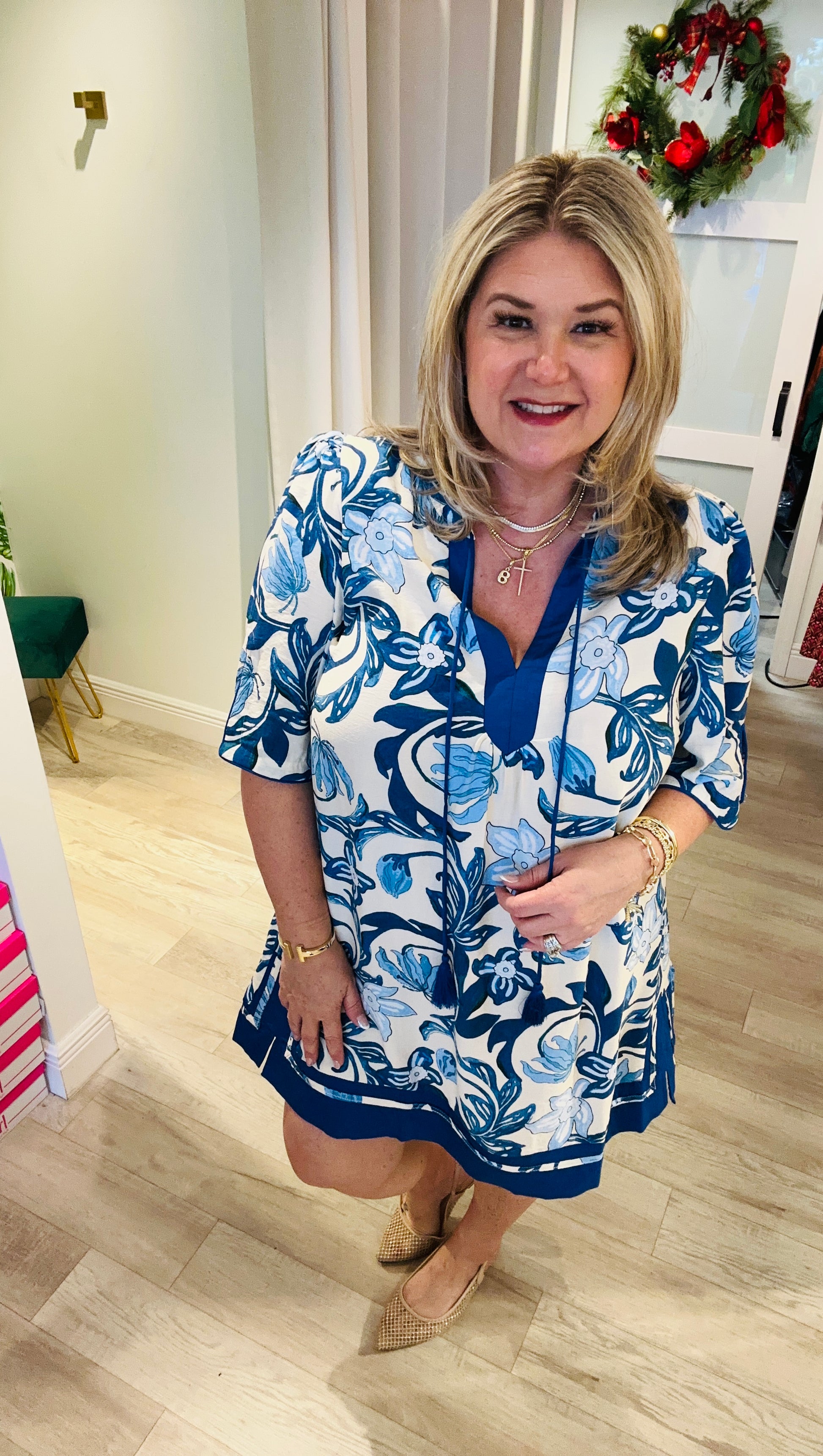 Meet the Blue Botanical Dress, your new effortless statement piece. This stunning dress features a rich ivory base adorned with bold blue botanical prints that bring a fresh, coastal elegance to your wardrobe. The relaxed silhouette keeps you cool and comfortable, while the contrast neckline and border hem add the perfect touch of polish.