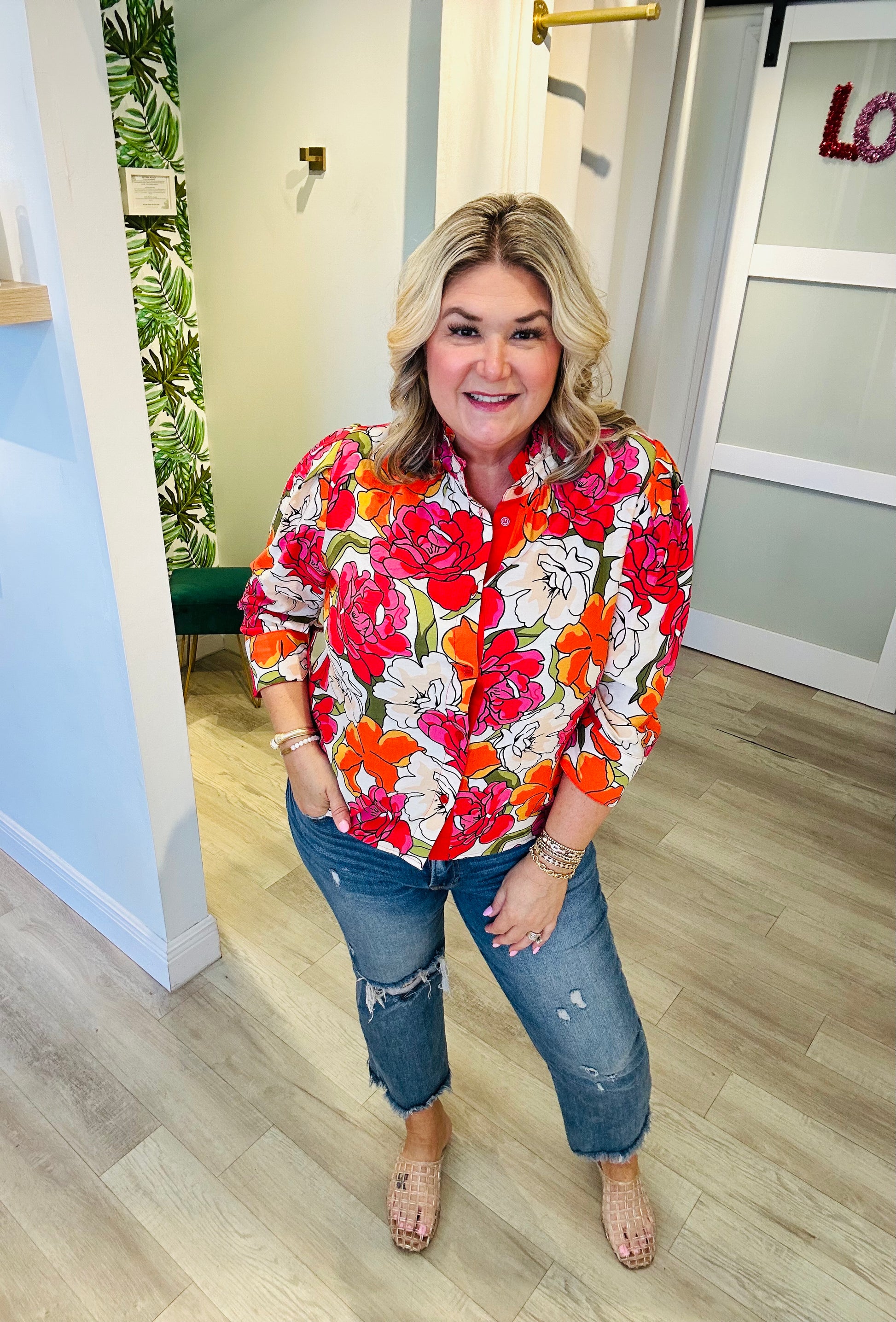 Featuring a charming ruffled neckline, button-front detail, and a bold bouquet print bursting with pinks, corals, and greens, this top is equal parts feminine and eye-catching. The sleeves cuff effortlessly for a relaxed yet put-together vibe.