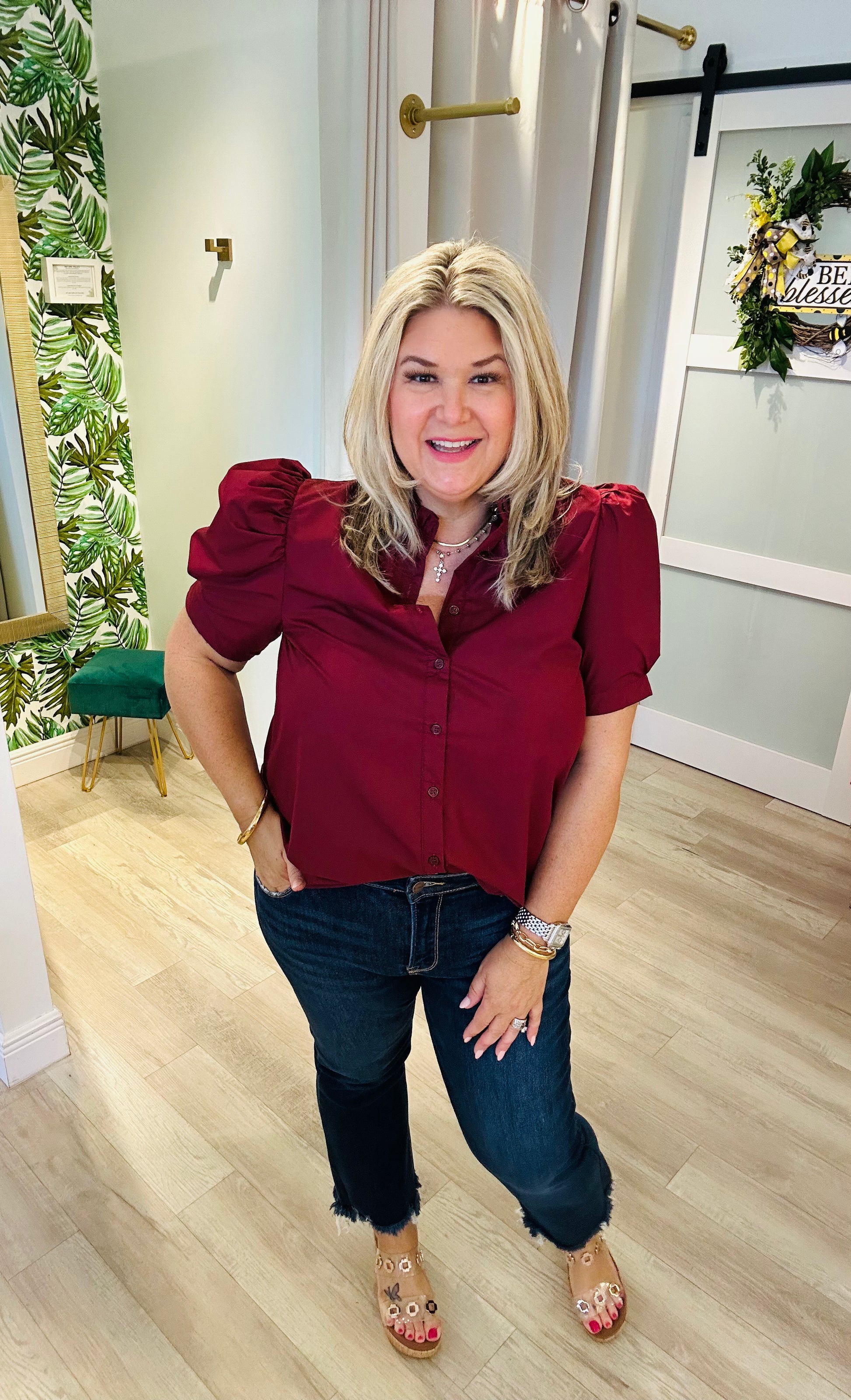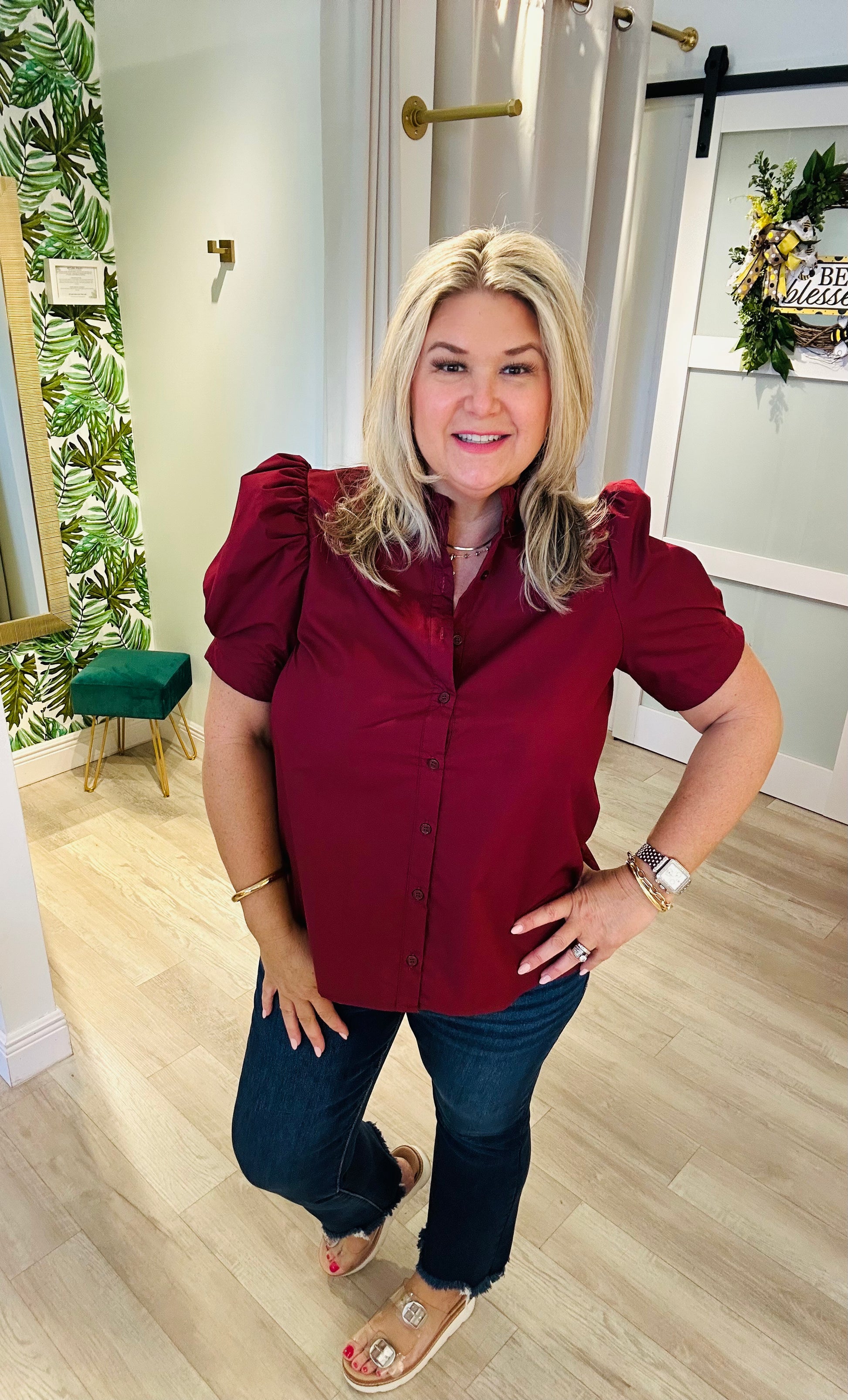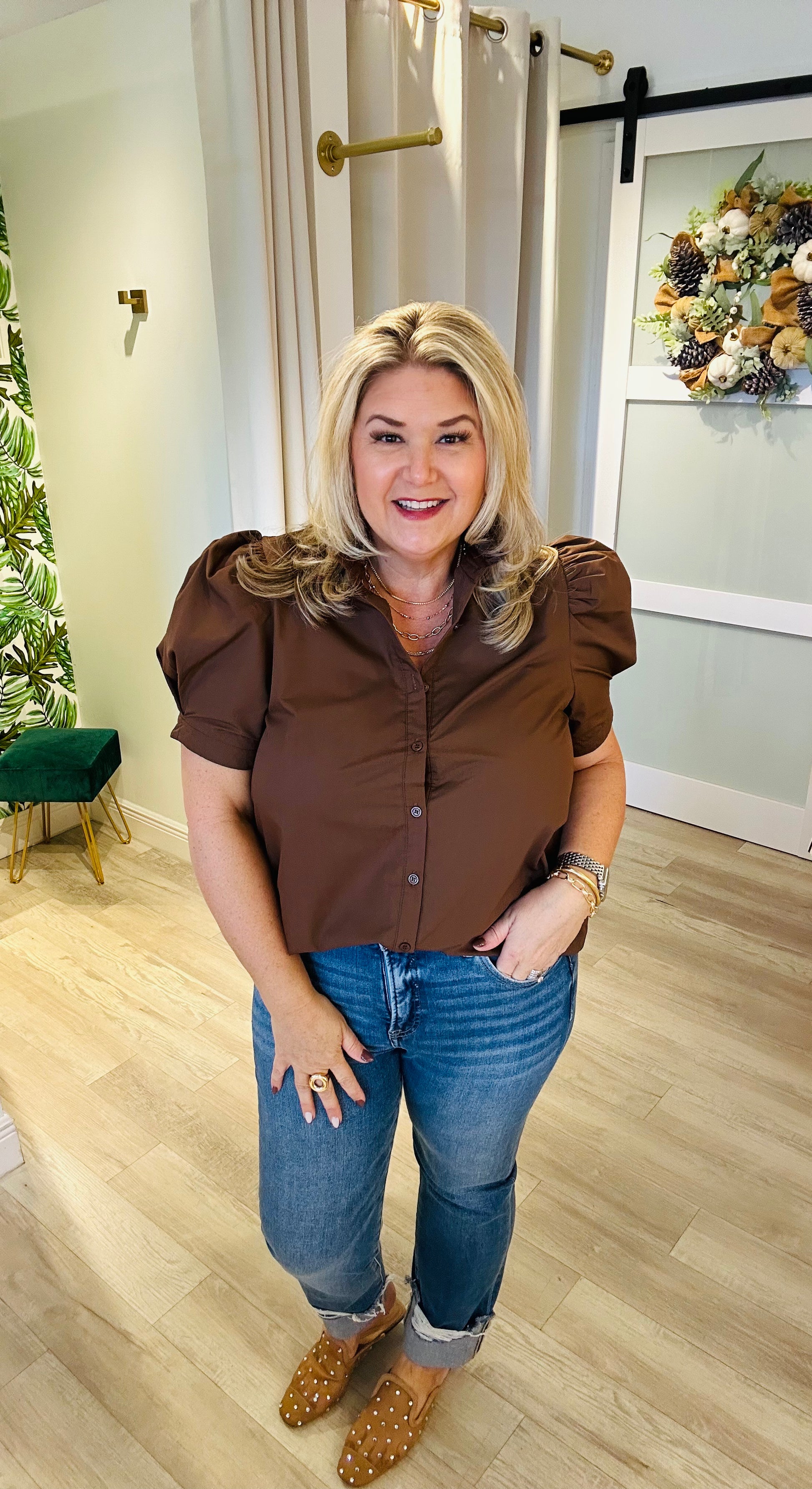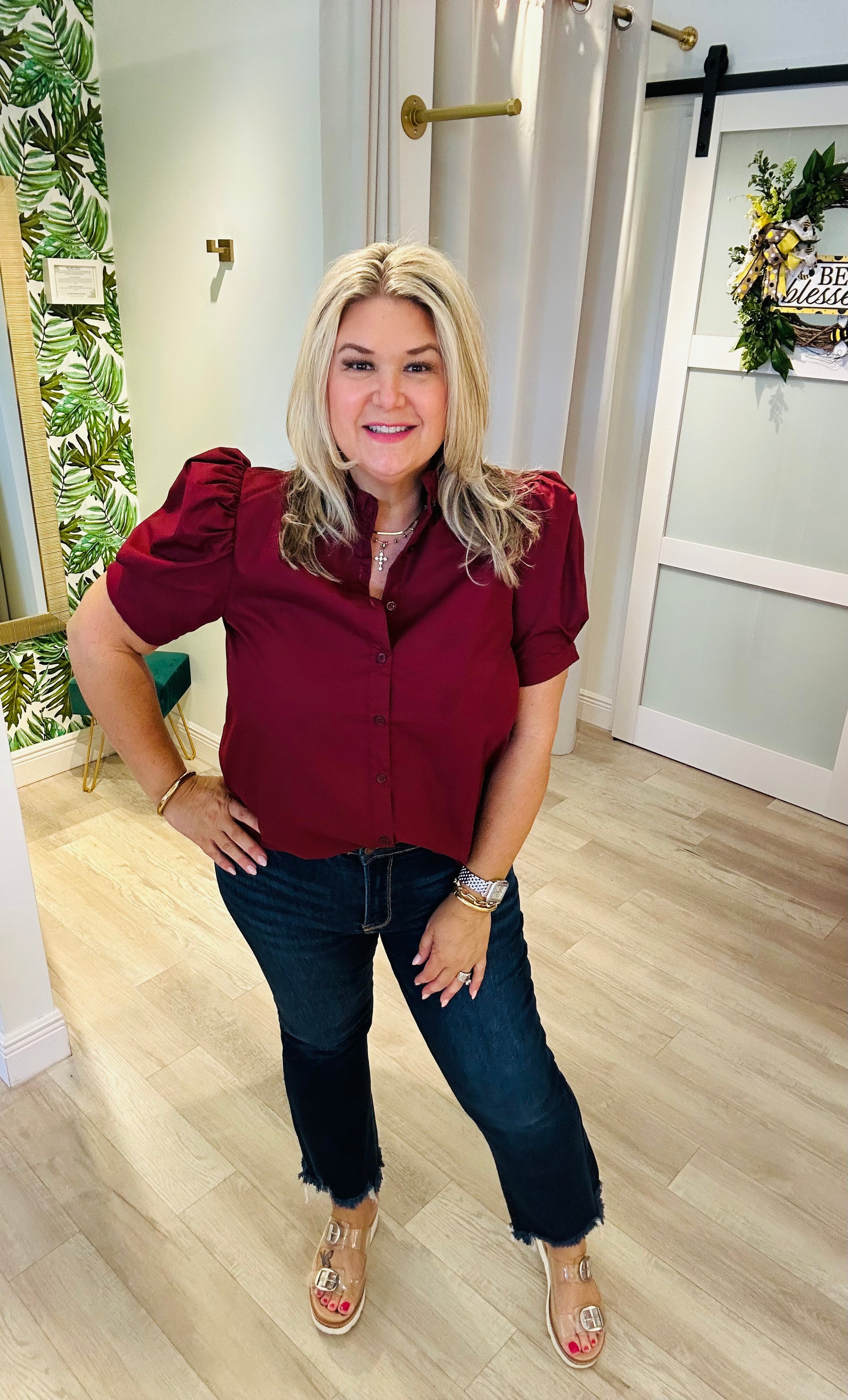 The Business as Usual Top is a polished staple with a touch of feminine charm. Crafted from a blend of 65% polyester and 35% cotton, this top offers both comfort and structure. Featuring a ruffled neckline, button-down front, and subtly puffed sleeves, it’s perfect for adding a stylish twist to your workwear wardrobe. Pair it with trousers for a professional look or with jeans for a chic, casual vibe that transitions seamlessly from office hours to after-hours.