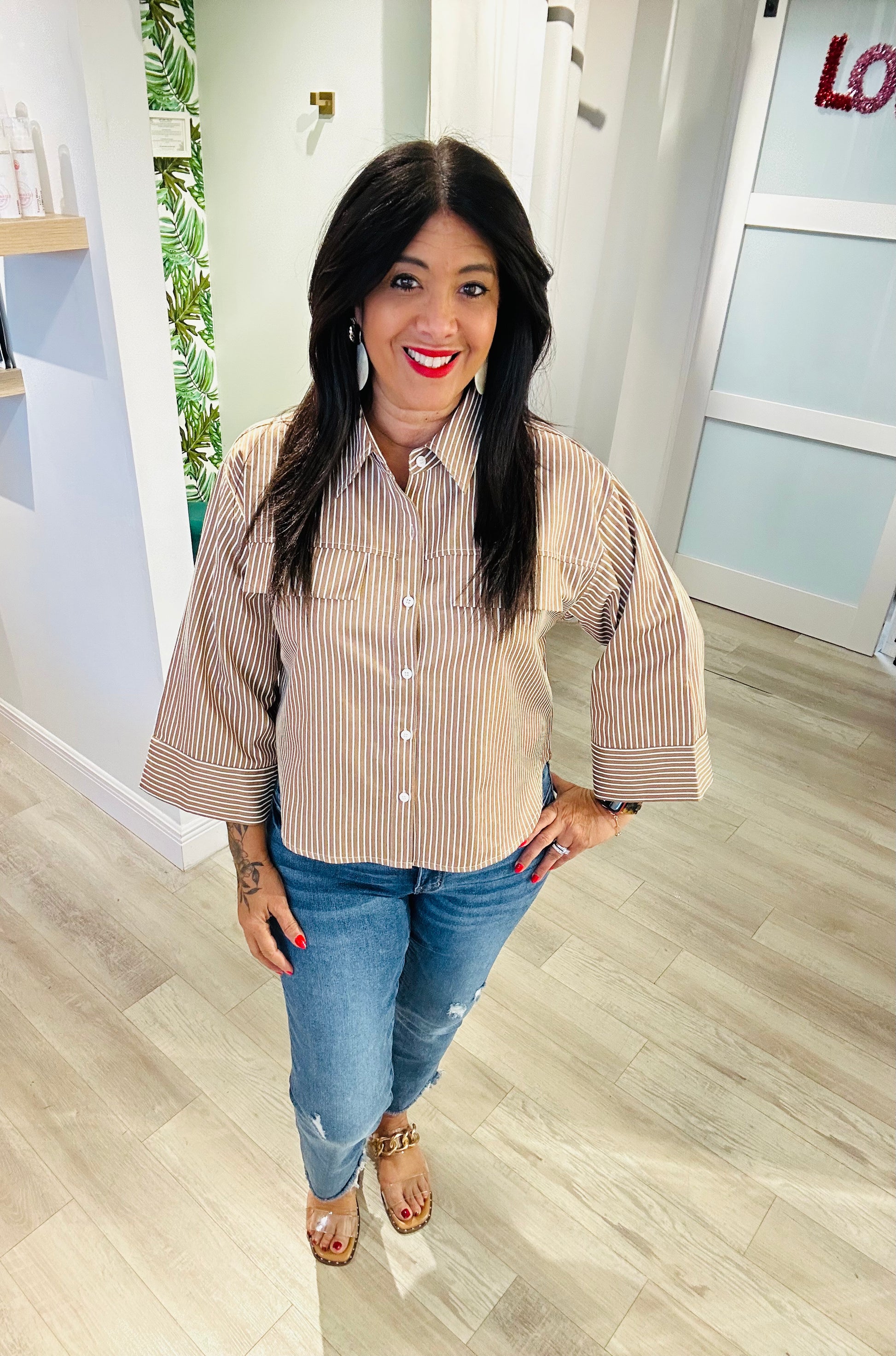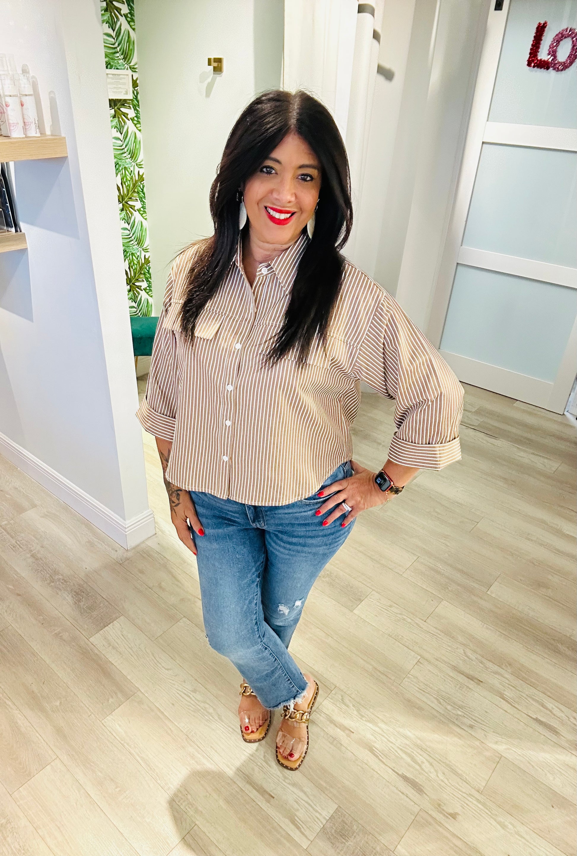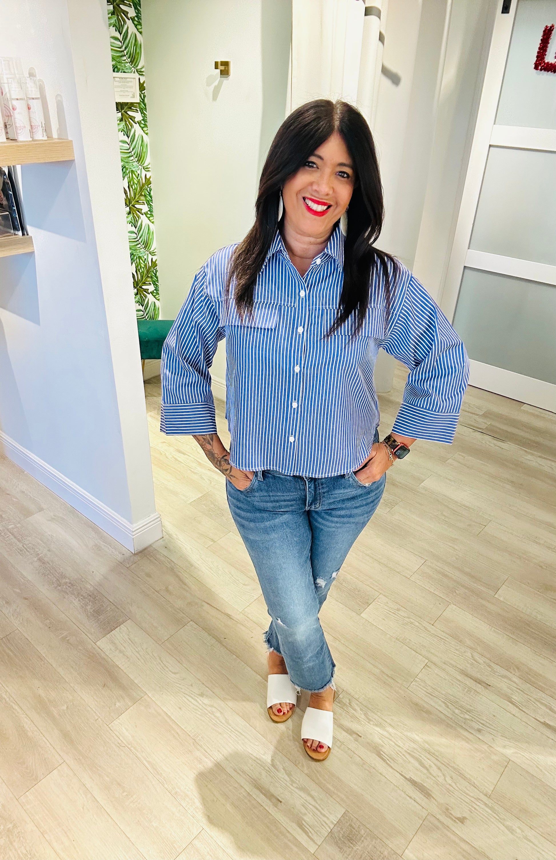 Effortlessly timeless and perfectly breezy, the Coastal Stripe Top brings that relaxed, coastal-cool charm to any outfit. Designed in a lightweight 65% polyester and 35% cotton blend, it features a flattering boxy silhouette, wide cuffed sleeves, and a classic button-front neckline that feels easy and elevated all at once. The vertical stripe pattern adds a touch of chic structure while keeping the look playful and fresh.