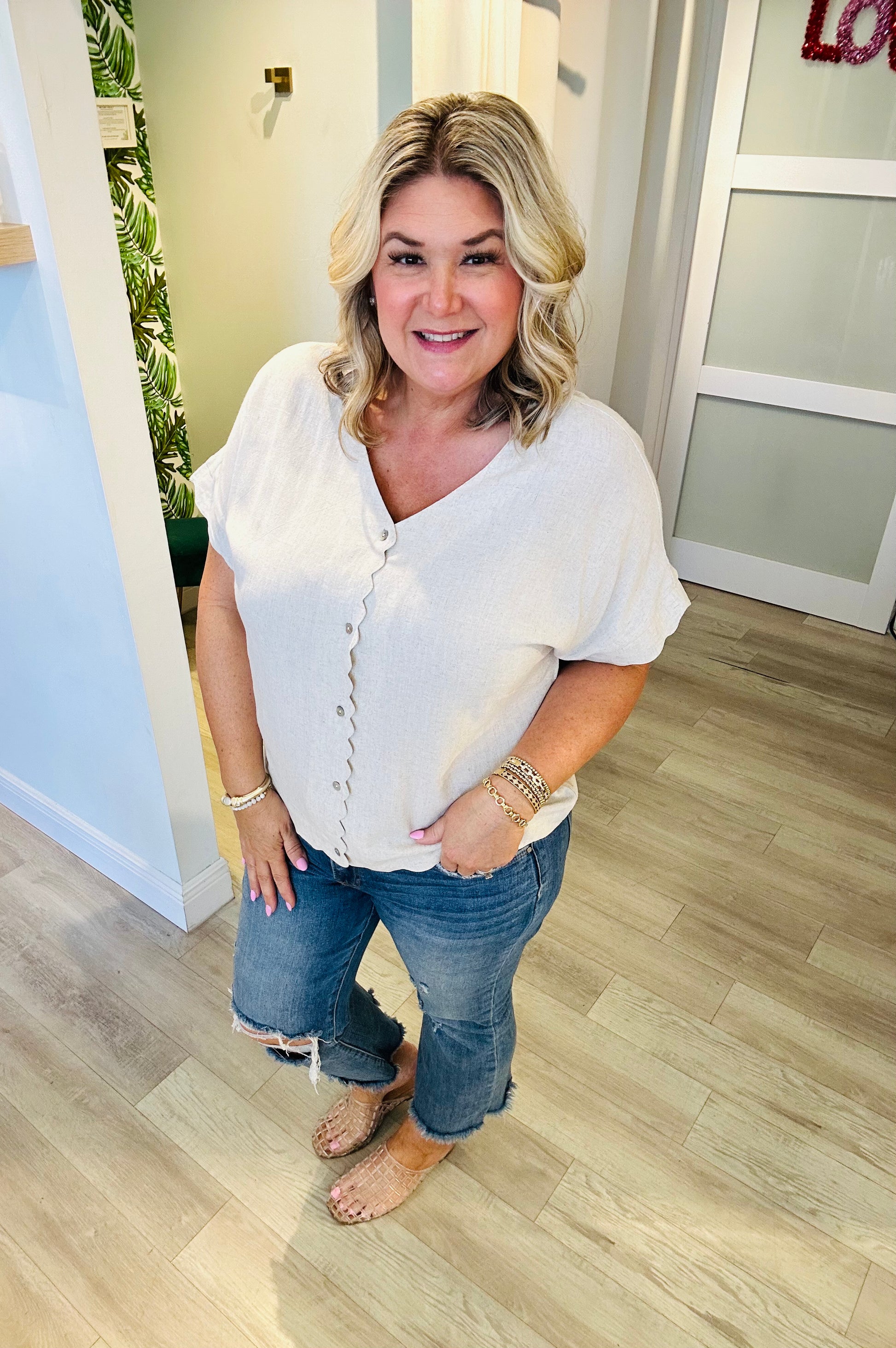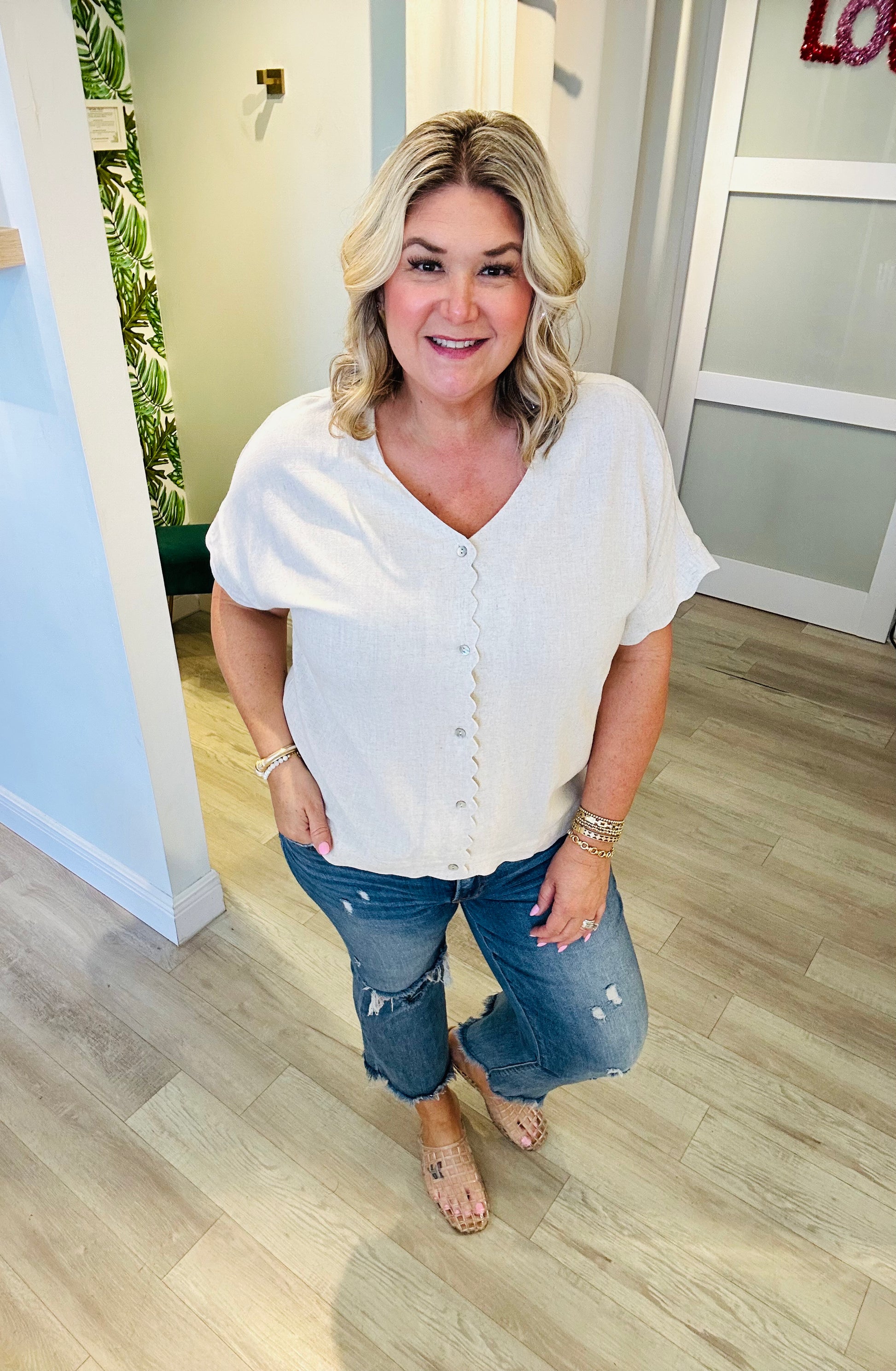 A flattering V-neckline meets a button-front design, while the scalloped sleeves and hem add a charming, feminine touch that sets this top apart. Pair it with your favorite denim for a relaxed daytime look or dress it up with linen trousers for coastal-chic perfection.