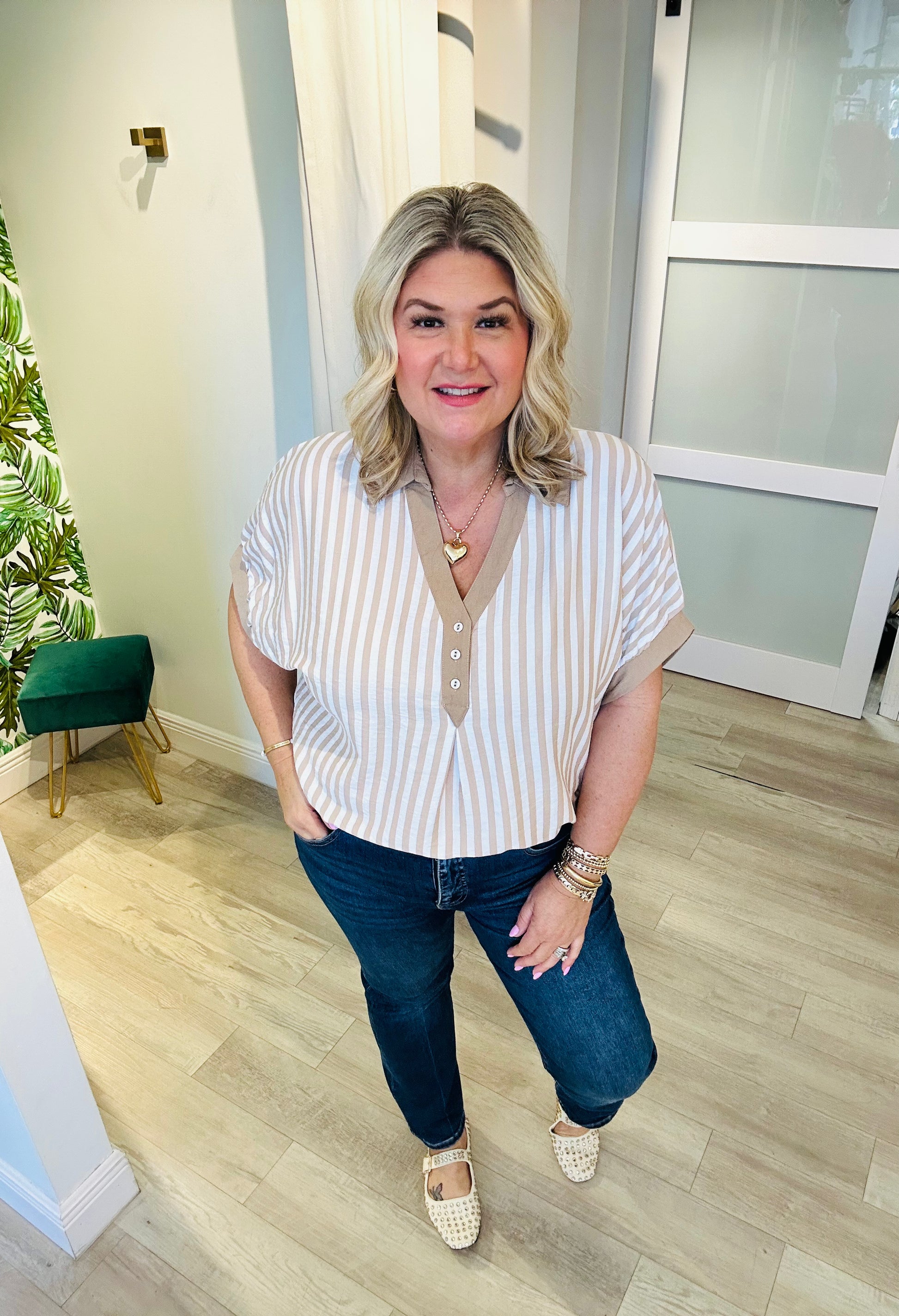 Effortless, relaxed, and coastal-chic—the Driftwood Stripe Top is your new everyday favorite. This oversized striped blouse features soft, earthy tones that channel that easy driftwood charm. Contrast detailing adds a touch of elevated style, while the elastic sleeves create a gently gathered finish for all-day comfort.