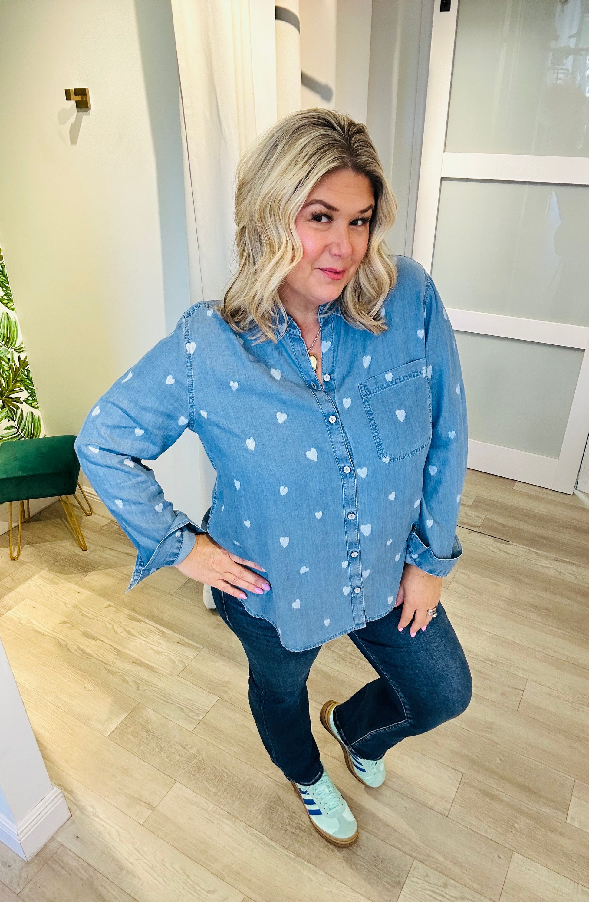 Fall head over heels for this charming long-sleeve denim button-down. The Ever In Love Top features a soft, lightweight denim wash sprinkled with the cutest white printed hearts for a playful, feel-good look. Designed with a classic collar, front pocket detail, and easy button-front styling, it’s the perfect blend of casual comfort and everyday sweetness.