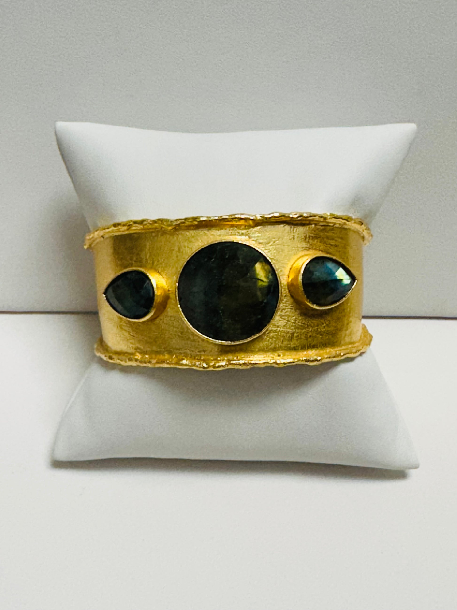 The Jewel Stone Cuff offers a choice of three semi-precious stones: Labradorite, Jade, or Mother of Pearl. Each cuff is finished in matte gold and enhanced with an 18k triple-dipped coating, ensuring lasting quality and a refined appearance. This expertly crafted piece combines natural beauty with durable elegance, making it a versatile accessory for both everyday wear and special occasions.