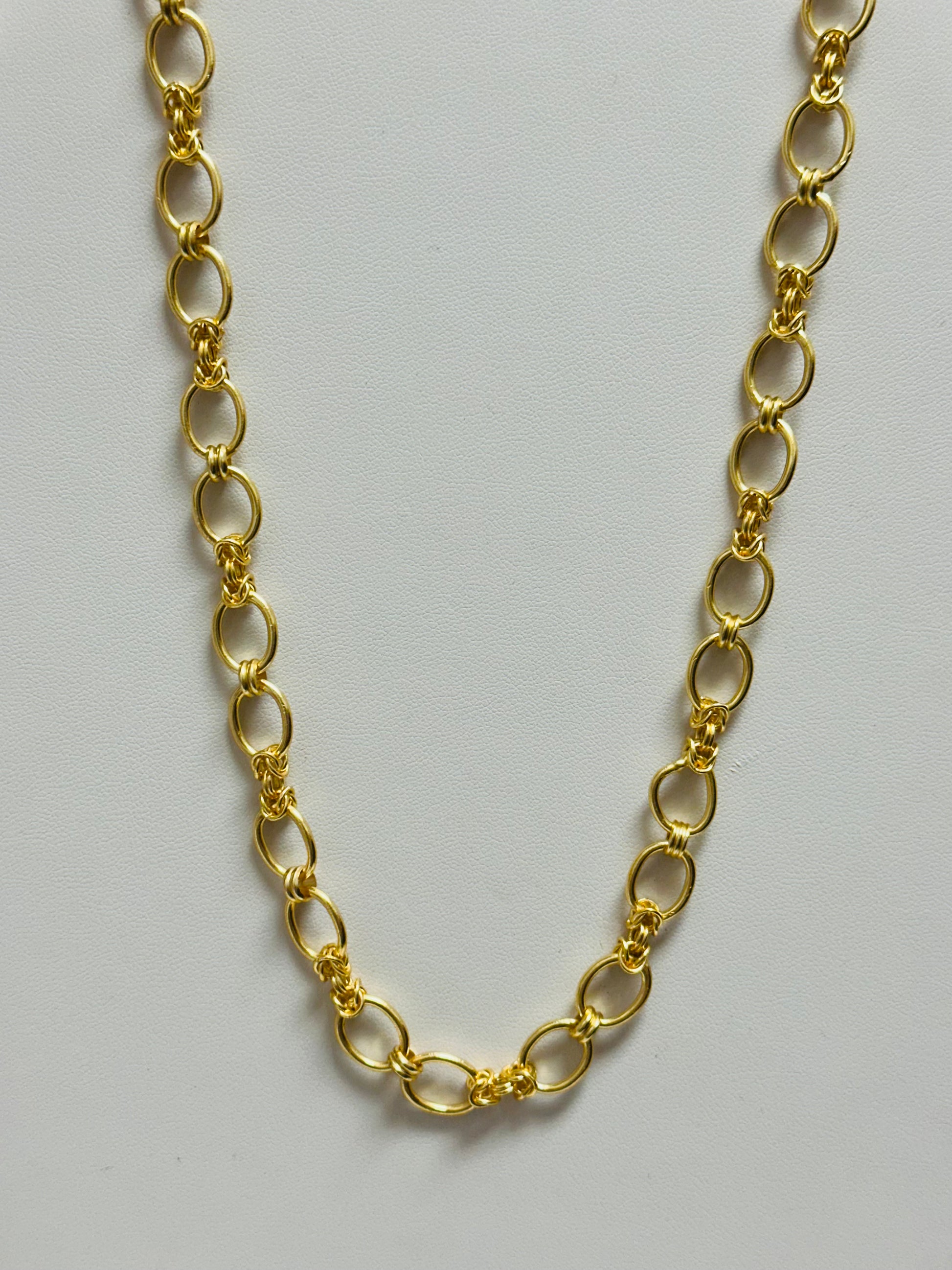 This Matte Circle Link chain features a sophisticated 18k gold triple-dipped finish, ensuring lasting richness and durability. Its matte gold surface offers a refined, understated elegance, while the magnetic clasp provides secure and easy fastening. Available in 16", 18", and 20" lengths, it suits a variety of styling preferences with expert craftsmanship.