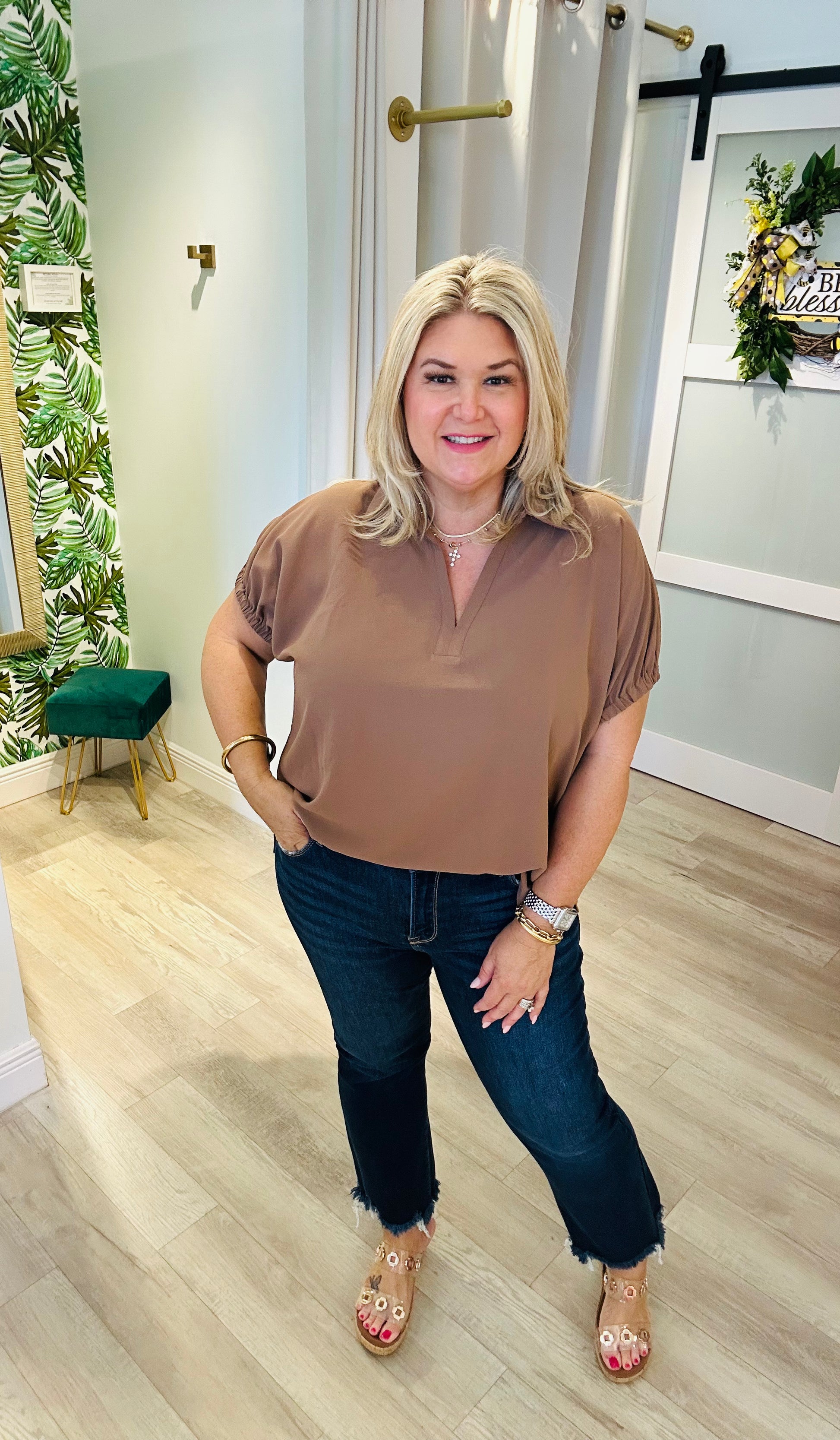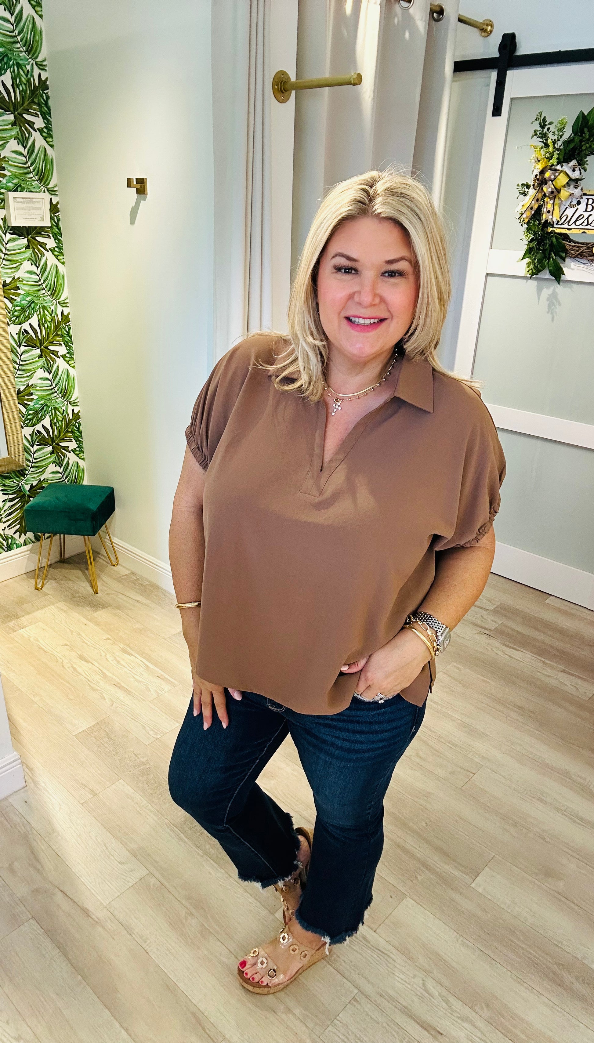 The Mocha Latte Top is a versatile wardrobe essential that blends comfort and style. Made from 100% polyester, it features a soft mocha hue with a collared neckline and a subtle V-cut for a polished touch. The gathered short sleeves add a hint of feminine detail, making it perfect for both casual days and dressed-up occasions. Pair it with jeans for a laid-back look or tailored pants for a chic, office-ready outfit.