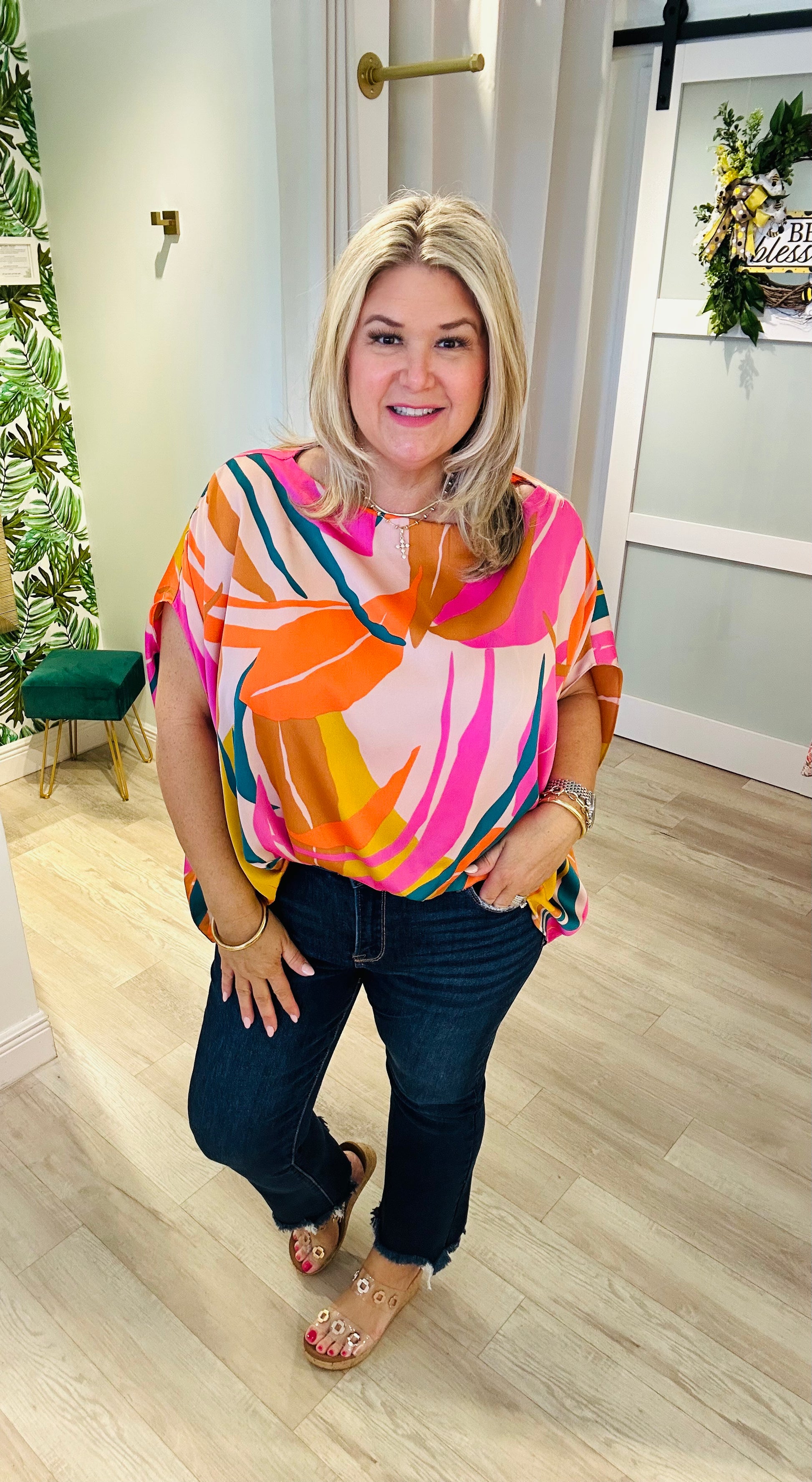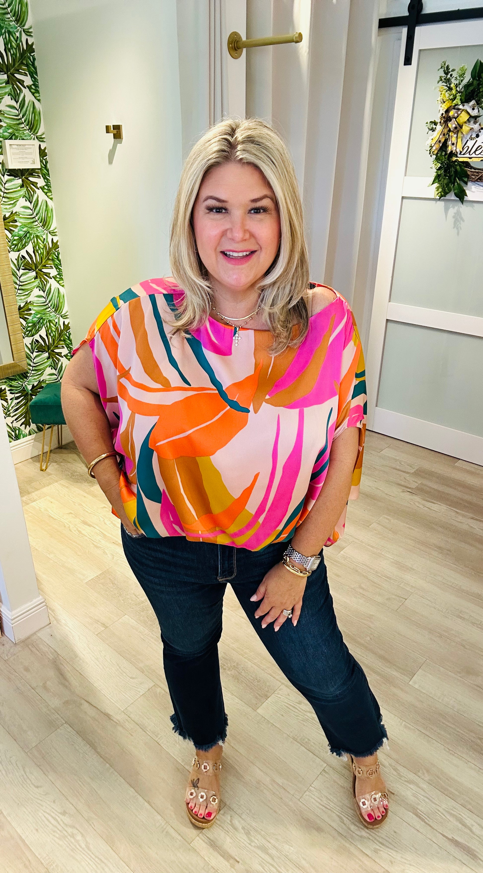 Turn heads wherever you go in the Paint the Town Top! 🎨 This vibrant, abstract print brings all the fun with bold pops of color that are sure to brighten your day. Featuring drapey sleeves for a flowy, flattering fit and an elastic waist that adds shape and comfort, this top is as easy to wear as it is eye-catching. Perfect for pairing with your favorite jeans or dress pants for a look that’s ready to go from day to night.