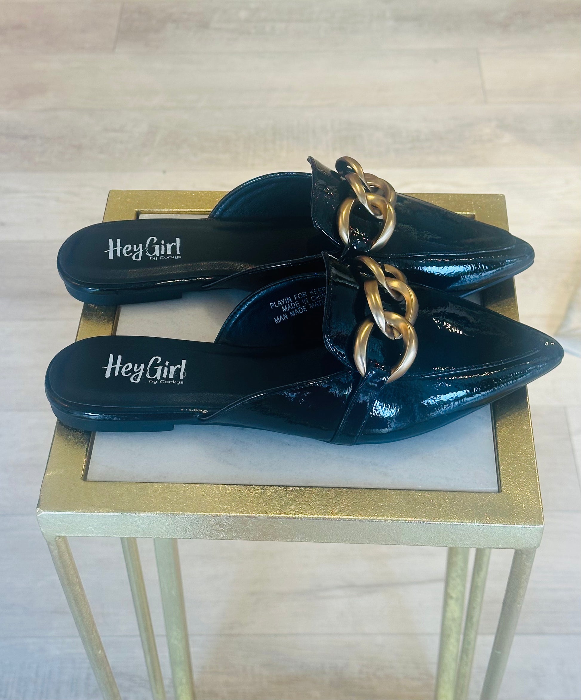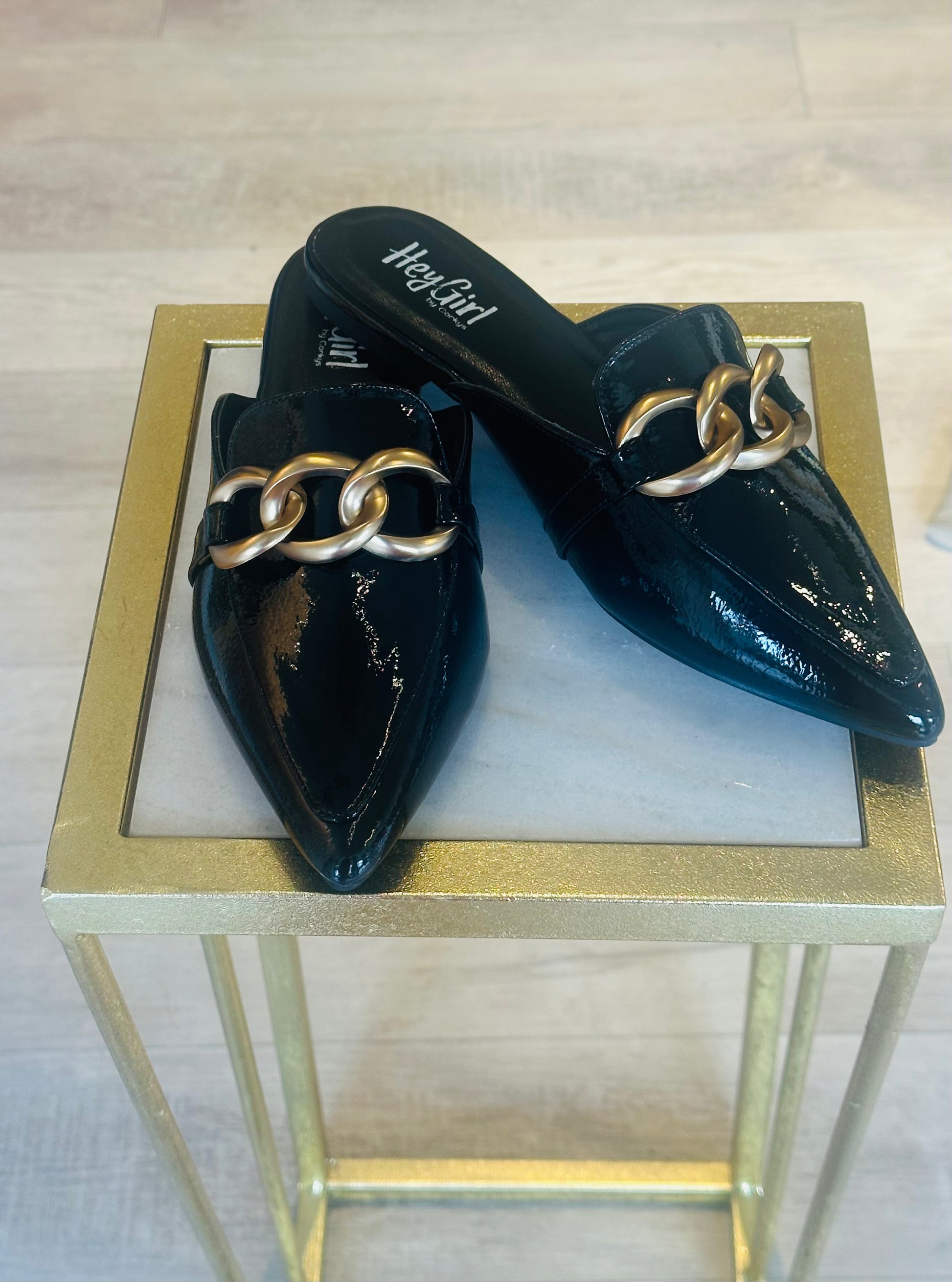 The Playin For Keeps mules feature a sleek glossy black patent leather finish with a sophisticated pointed toe. An oversized matte gold chain adds a bold, contemporary touch. Designed for effortless wear, these easy slip-ons are perfect for both professional office settings and casual looks with jeans. They run true to size, but if you have wider feet, sizing up is recommended since half sizes are not available.