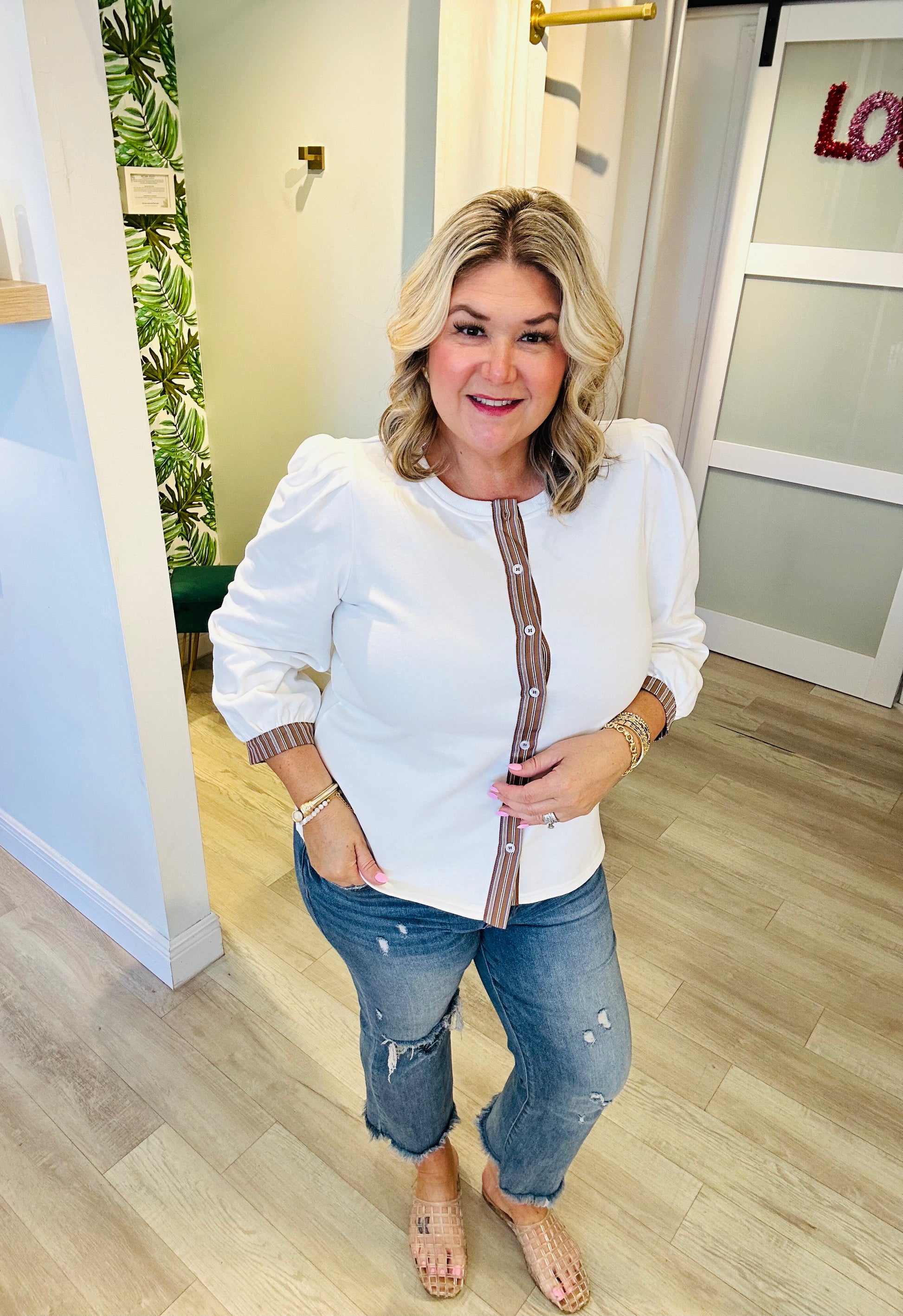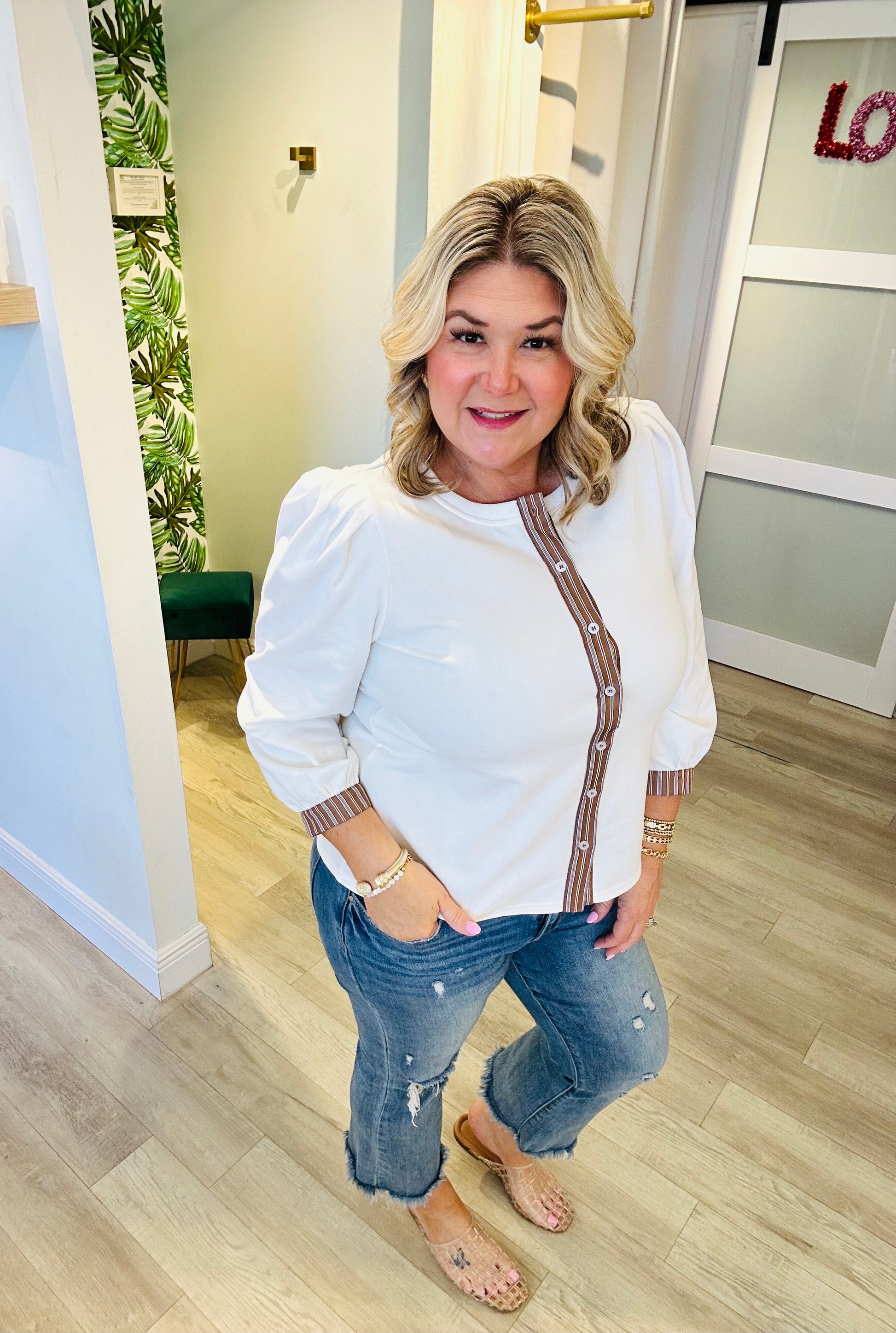 The subtle seam detailing adds shape and sophistication, while the 3/4 puff sleeves keep the look feminine and fresh. Lightweight and versatile, it’s the perfect throw-on layer for work, weekends, or your next chic coffee run.