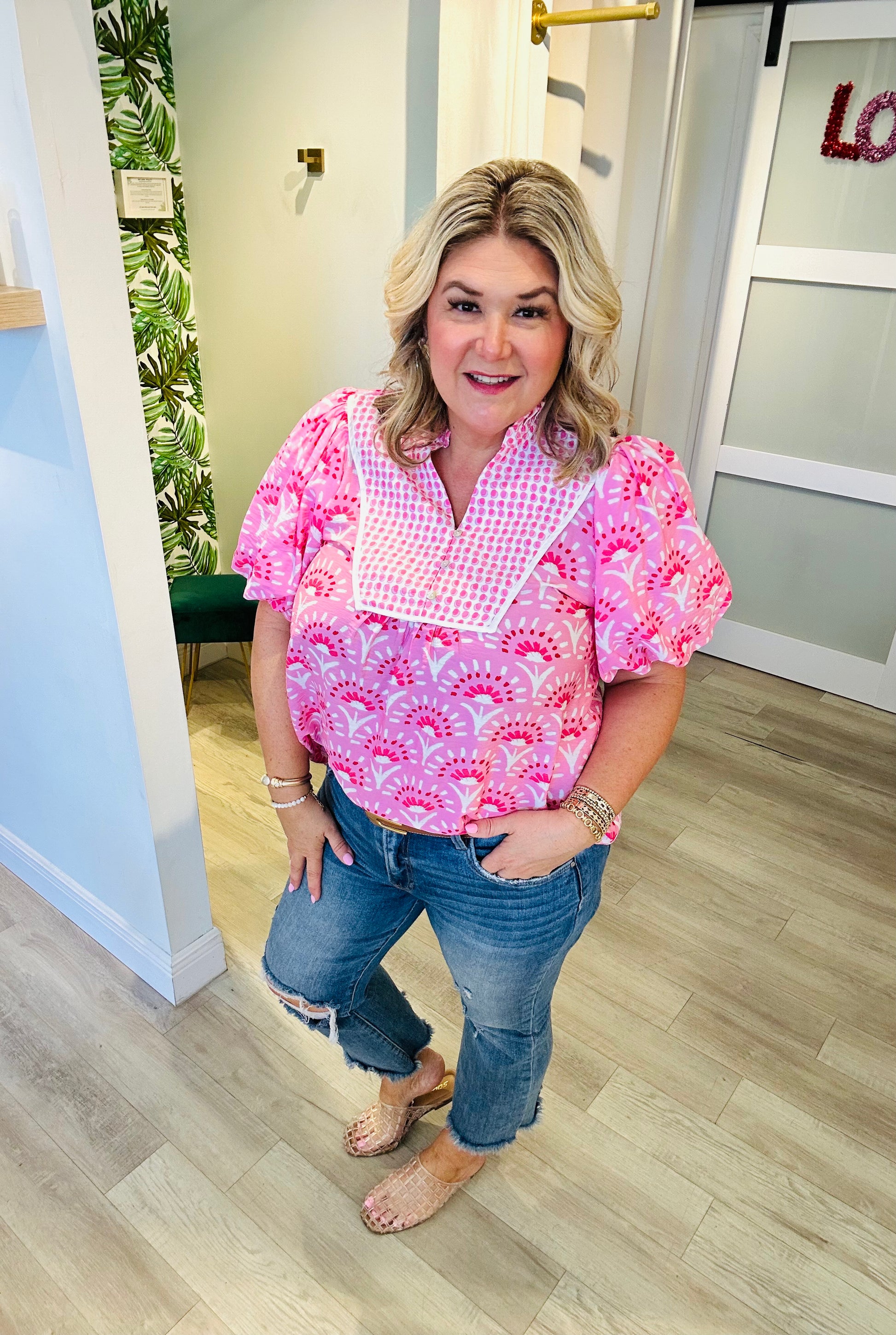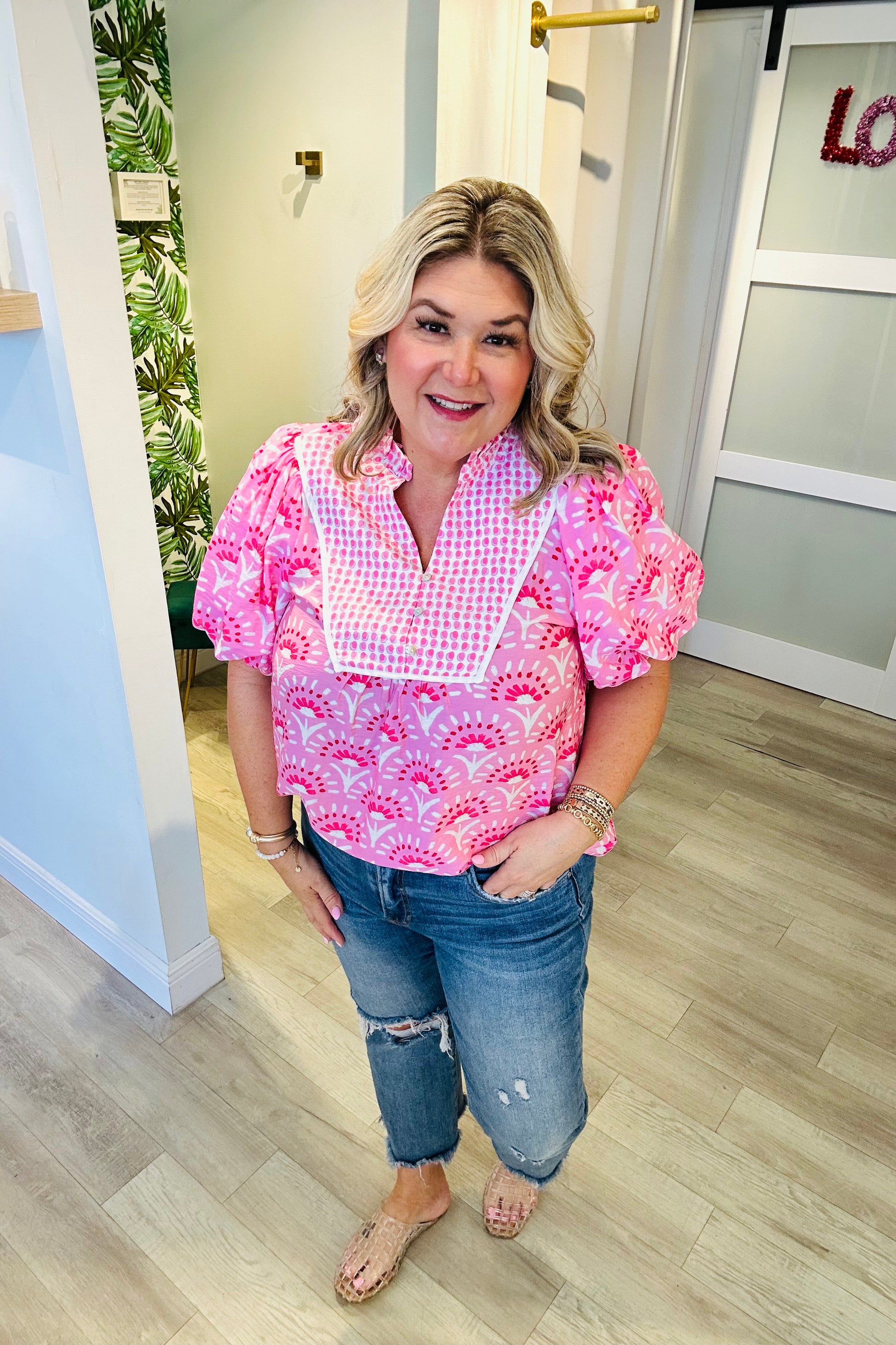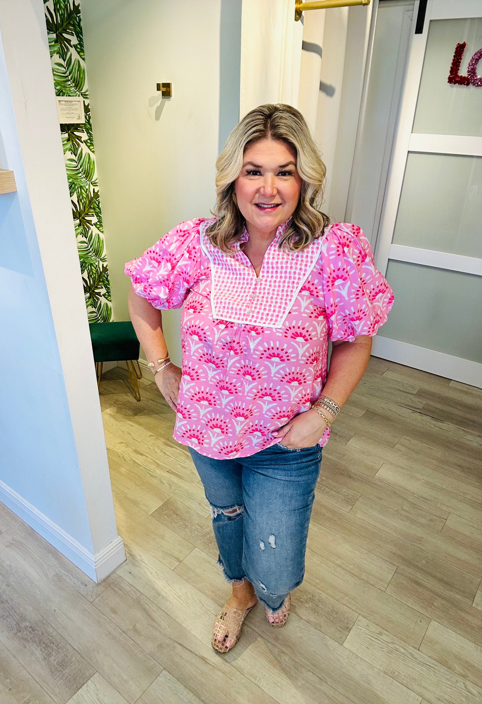 The playful pink palette and bold patterned design make this top an instant mood-booster, while the puff sleeves and contrast bib detail give it that polished, boutique-level finish. Pair it with your favorite denim for a casual day out, or dress it up with white pants for a fresh, Florida-ready look.