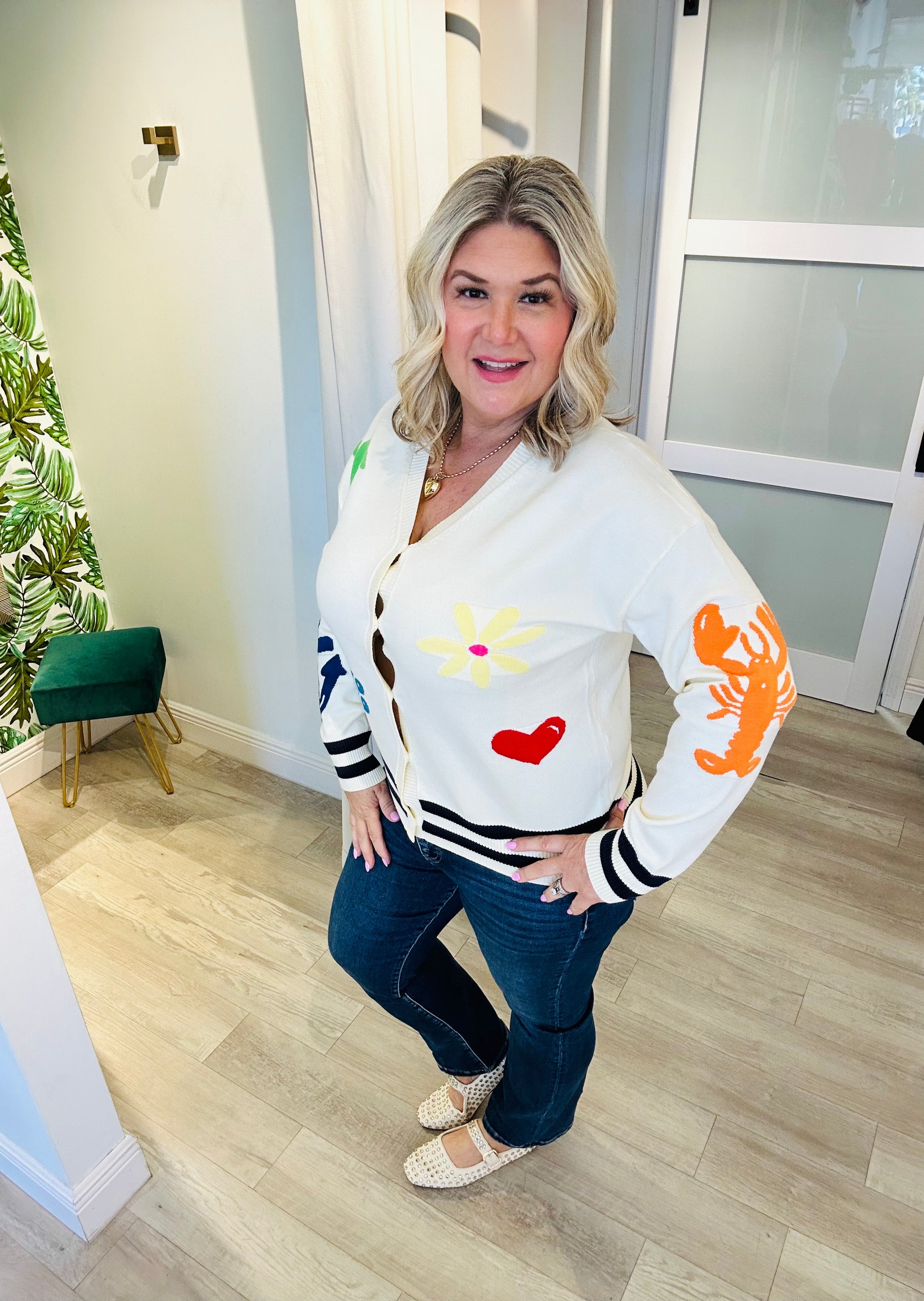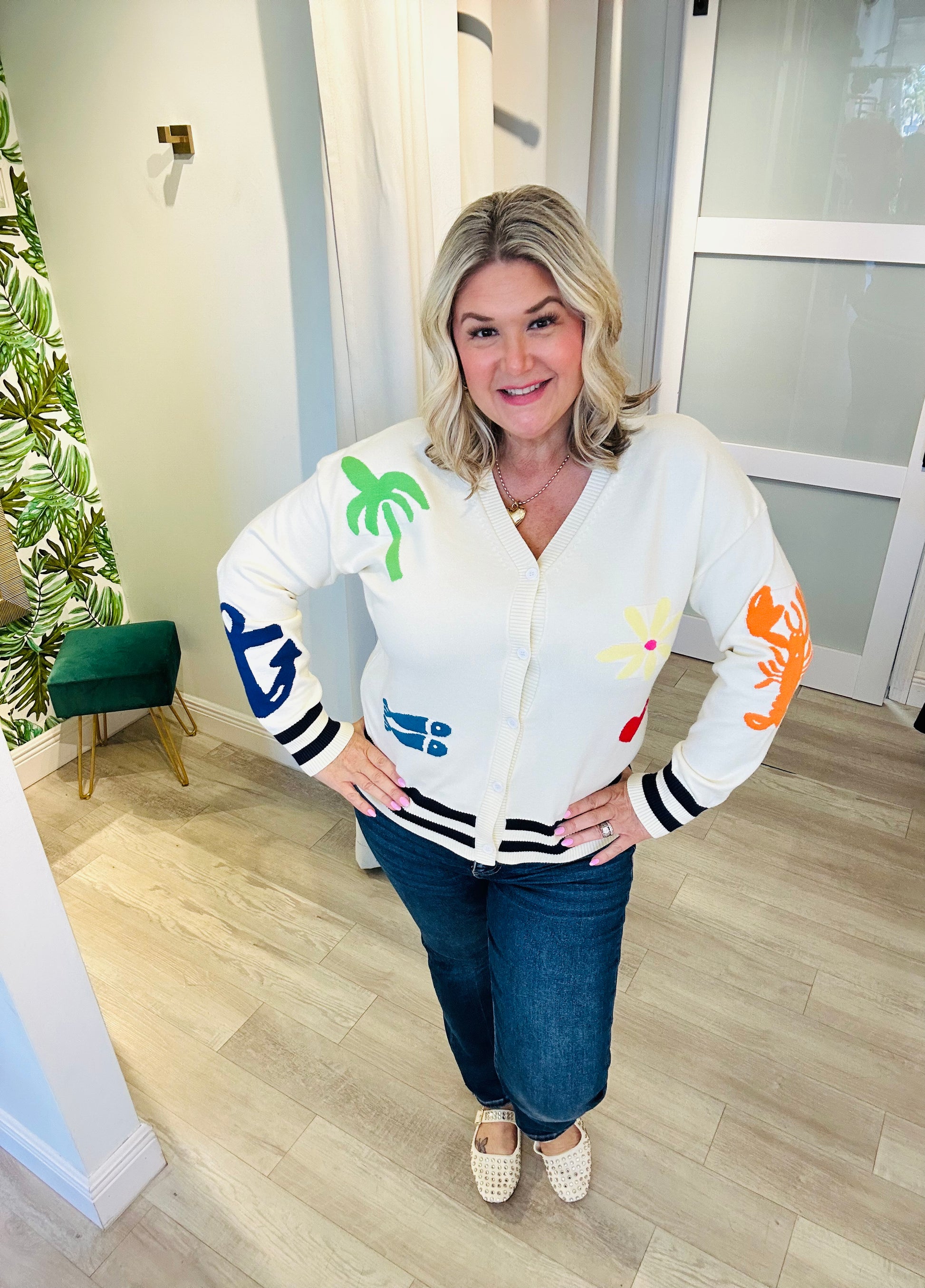 Bring a touch of coastal charm to your everyday style with our Seaside Cardigan, a soft and playful statement layer perfect for Florida living. This lightweight knit features bold, colorful seaside-inspired patches—think palm trees, anchors, flowers, hearts, and a vibrant lobster—making it the ultimate coastal cardigan for effortless, sunny styling.