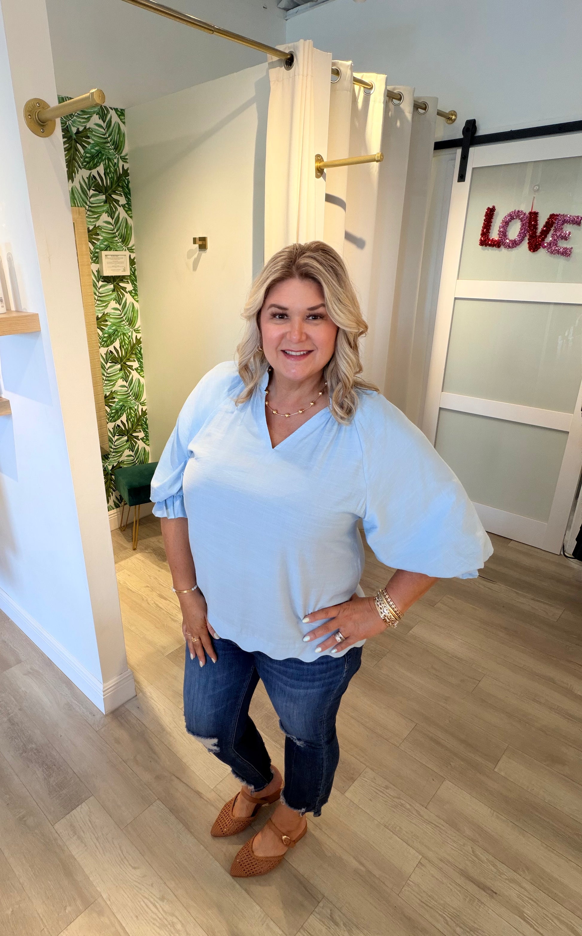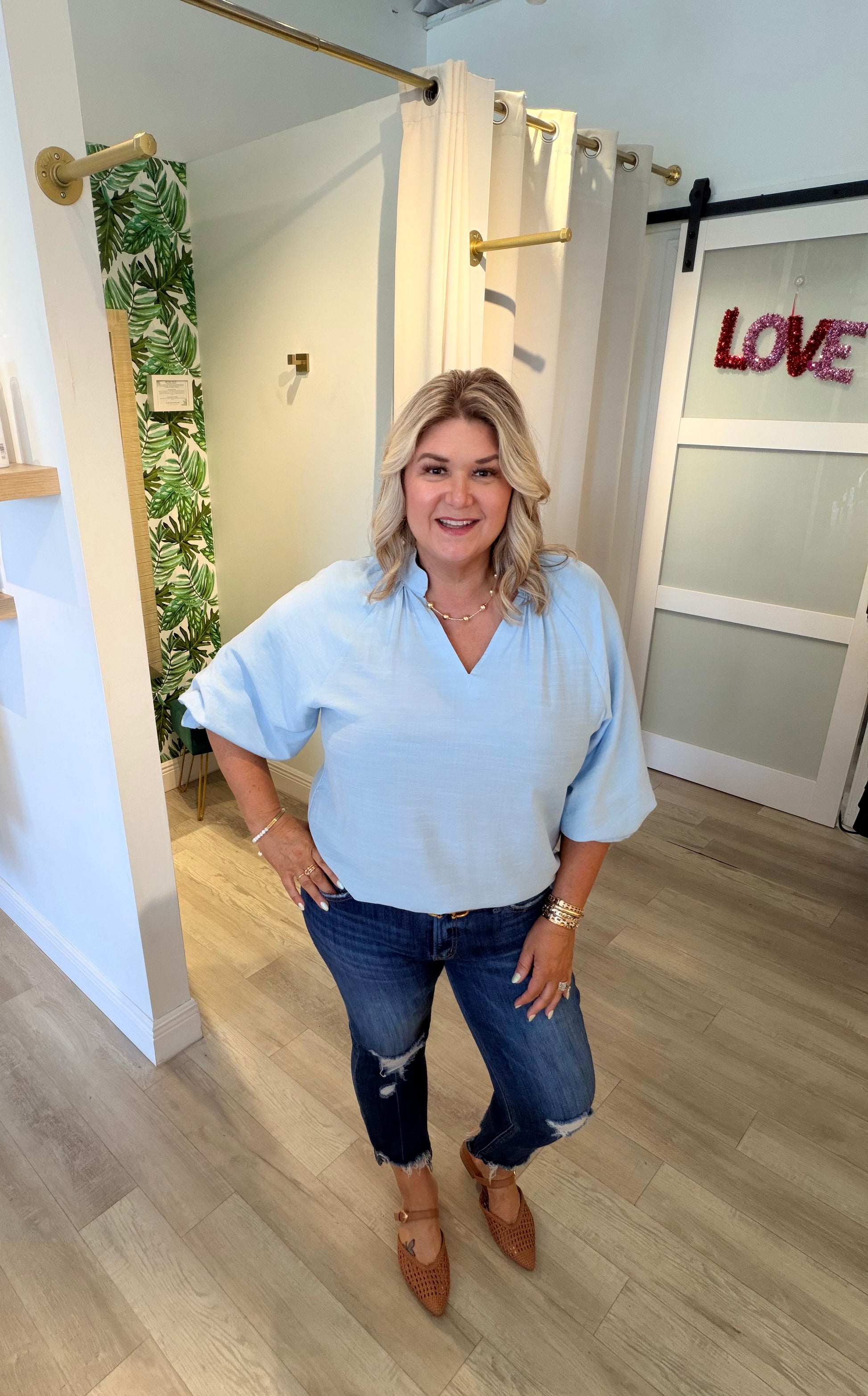 The Sky Blue Scalloped Button V-Neck Top is the perfect blend of polished and effortless. Designed in a soft, airy fabric, this flattering V-neckline features delicate scalloped detailing with subtle button accents that add just the right touch of charm. The flowy 3/4 sleeves offer comfortable coverage with an easy, feminine drape that moves beautifully with you.