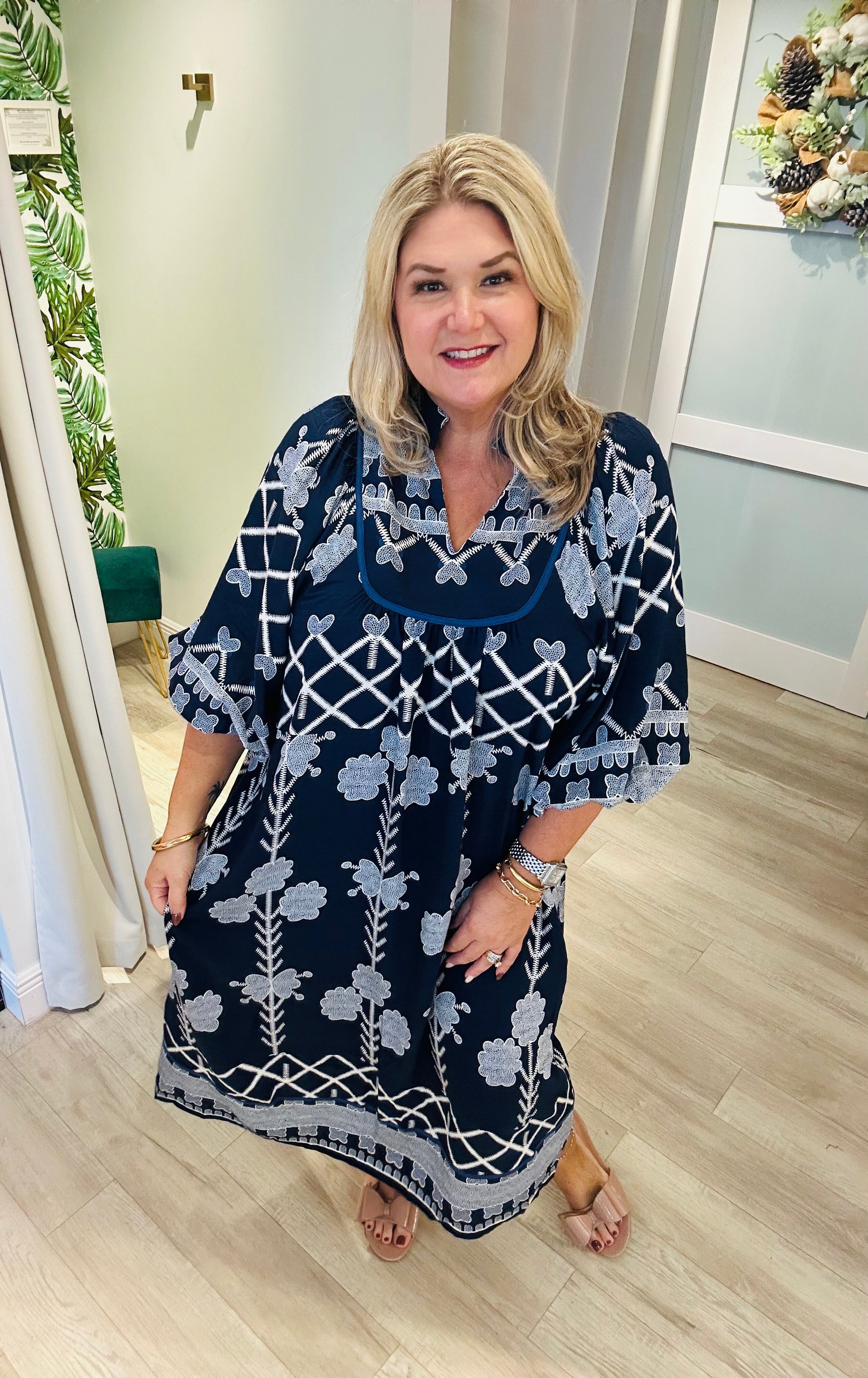 Effortlessly elegant with a touch of boho charm, the Colette Dress is a true standout piece. Featuring a rich navy background adorned with intricate cream embroidery, this midi-length beauty offers a timeless silhouette with a modern twist. The collared neckline and split V detail create a polished finish, while the billowy sleeves add just the right amount of movement and grace.