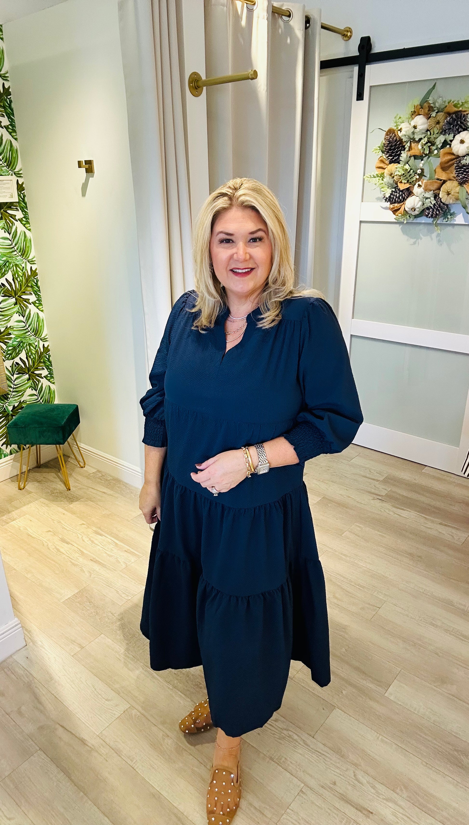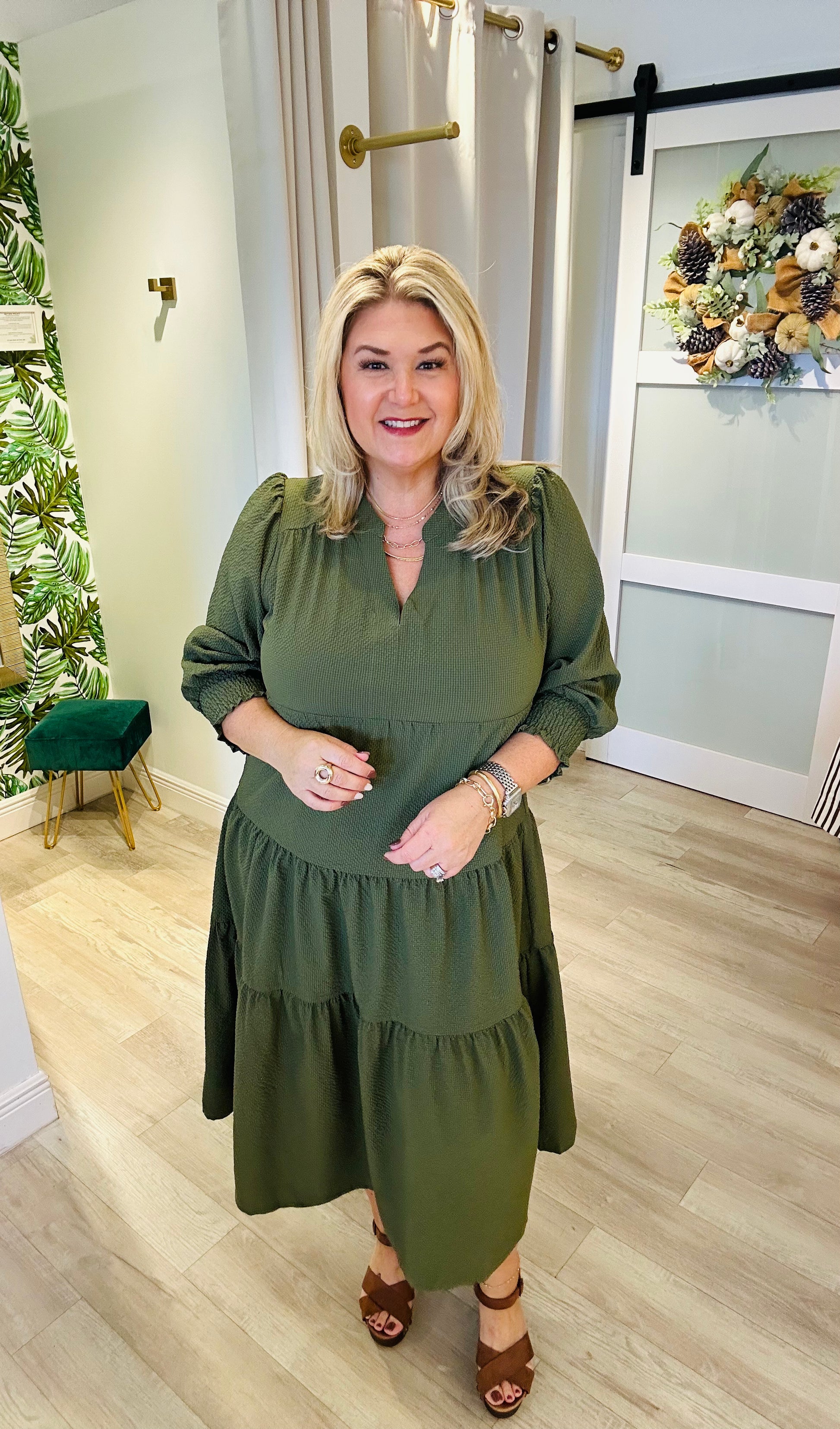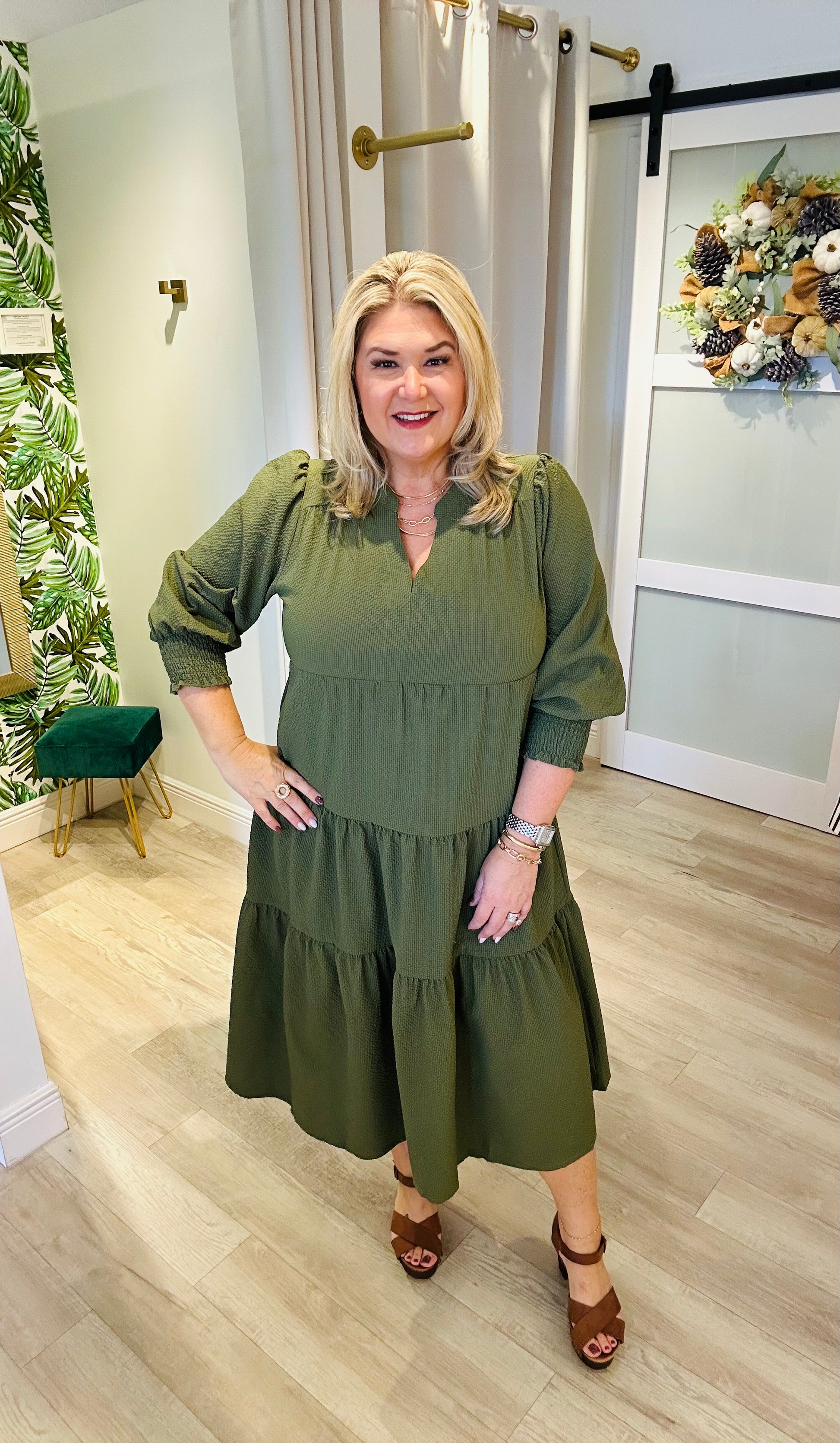 The Remi Dress is a timeless wardrobe staple designed with elegance and versatility in mind. Perfect for the workplace, teachers, or church, this classic tiered midi dress features a flattering V-neckline and three-quarter sleeves for a polished yet comfortable fit. Available in two beautiful colors—rich navy blue and deep olive green—this dress transitions effortlessly from day to night, making it a go-to piece for any occasion.